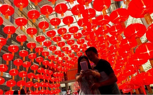 Một cặp đôi đang chụp ảnh “tự sướng” trong lễ hội đèn lồng truyền thống tại một khu trung tâm thương mại ở Kualur Lumpr, Malaysia |