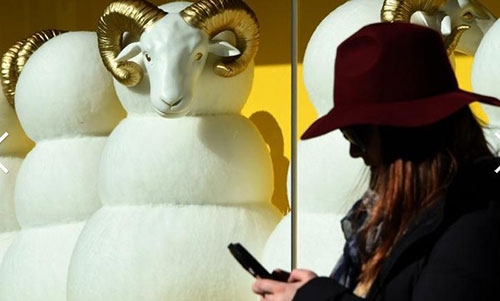 Một cô gái trước một cửa hiệu trang hoàng con cừu, biểu tượng của năm âm lịch sắp đến, tại thành phố Tokyo, Nhật Bản |