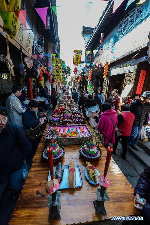 Du khách tham quan thực phẩm truyền thống đang trưng bày trên đường phố ở Tangqi Town |