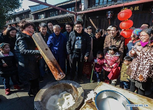 Một du khách trải nghiệm quá trình làm bánh gạo truyền thống trên đường phố ở Tangqi Town |