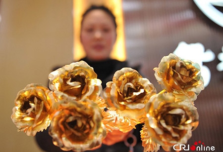 | Một cửa hàng ở tỉnh Chiết Giang, Trung Quốc, bày bán những bông hồng bằng vàng ròng 24 caras, nhân ngày 14/2. Nhiều khách hàng tỏ ra thích thú với bông hồng tình yêu đặc biệt này. Ảnh: CRI |