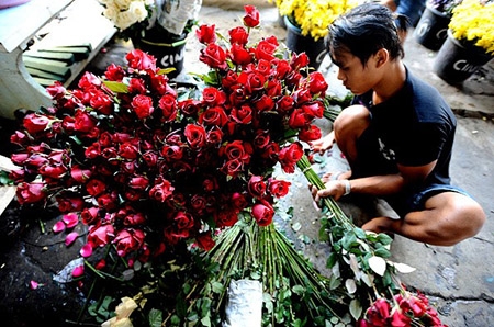 | Người bán hoa bận rộn chuẩn bị hoa hồng để phục vụ các cặp đôi tới mua tại khu chợ truyền thống ở Surabaya, Indonesia. Ảnh: Getty |