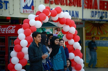 | Giới trẻ Pakistan chụp hình dưới cổng chào có bóng bay đỏ và trắng ở Islamabad trong Lễ tình nhân. Ảnh: Getty |