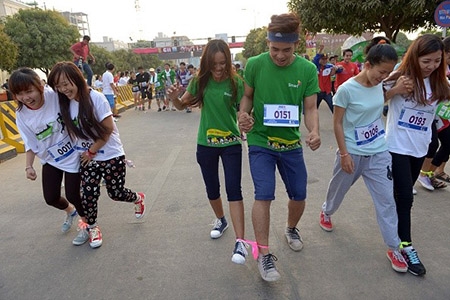 | Thanh niên Campuchia mừng ngày 14/2 bằng trò chơi buộc chân hai người tại Phnom Penh. Ảnh: Getty |