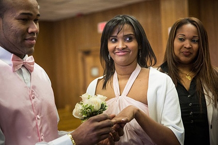 | Jesus Romualdo và Poliana de Oliveira kết hôn trong lễ cưới tập thể của trước thềm Valentine ở Newark, New Jersey, Mỹ. Kể từ năm 2002, hàng năm thành phố Newark đều tổ chức lễ cưới cho khoảng 100 cặp đôi trong dịp 14/2. Ảnh: Getty |