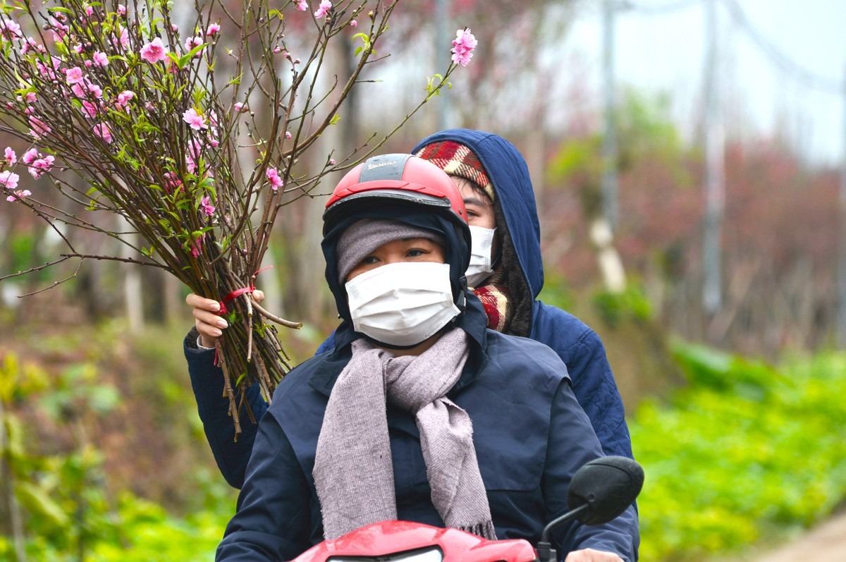 Những người xe ôm đang vận chuyển đào cho khách hàng tại các nhà vườn ở làng Nhật Tân. Việc vận chuyển đào được những người lao động này cho rằng là kiếm được hơn những công việc thường ngày của họ, cho nên nhiều người đã "tạm nghỉ" nghề cũ để đi vận chuyển đào thuê.