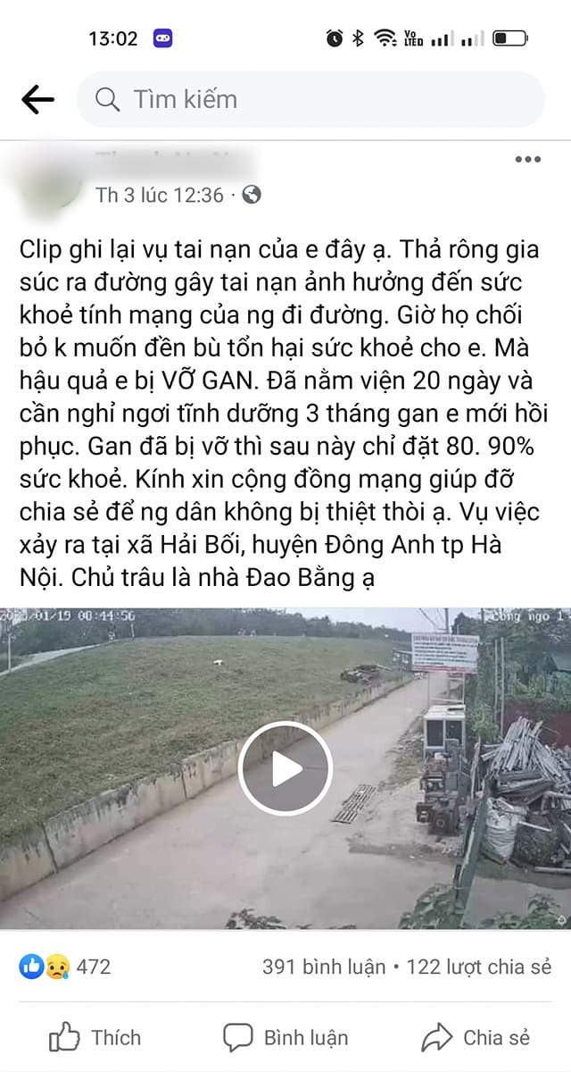 Hiện chủ trâu được cho là vẫn không liên hệ để đền bù cho nạn nhân khiến người này vô cùng bức xúc nên đã đăng tải vụ việc để nhờ cộng đồng mạng xã hội giúp đỡ.