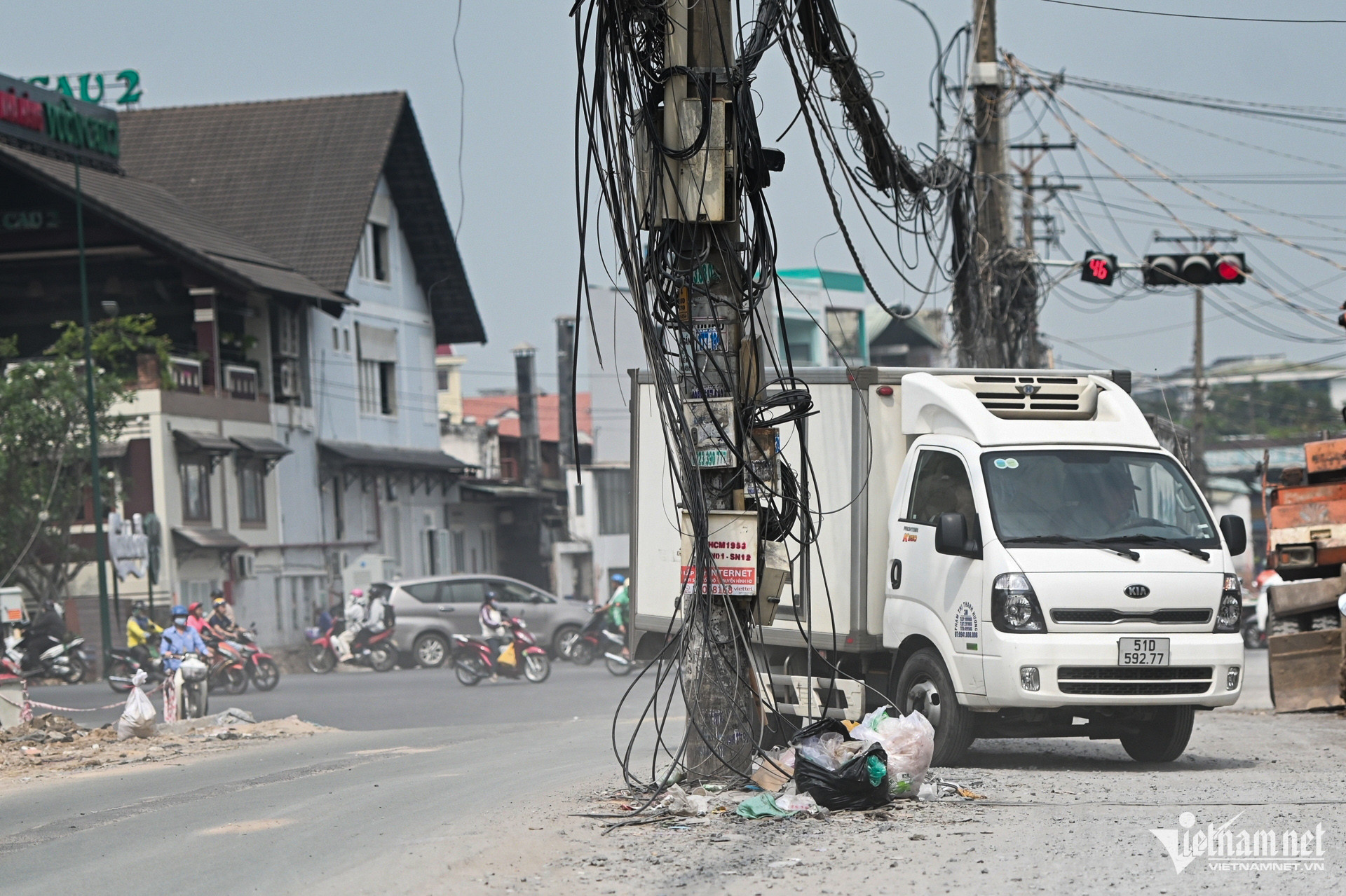 Dự án mở rộng đường Dương Quảng Hàm (Gò Vấp) đã hoàn thành trải nhựa ở nhiều đoạn nhưng dãy cột điện cũ vẫn chưa được di dời. Tài xế ô tô và người đi xe máy phải luồn lách qua "ma trận" chướng ngại vật này mỗi ngày.