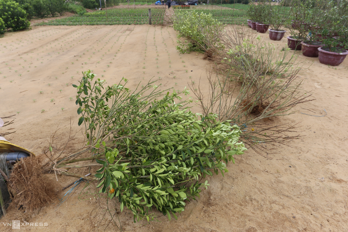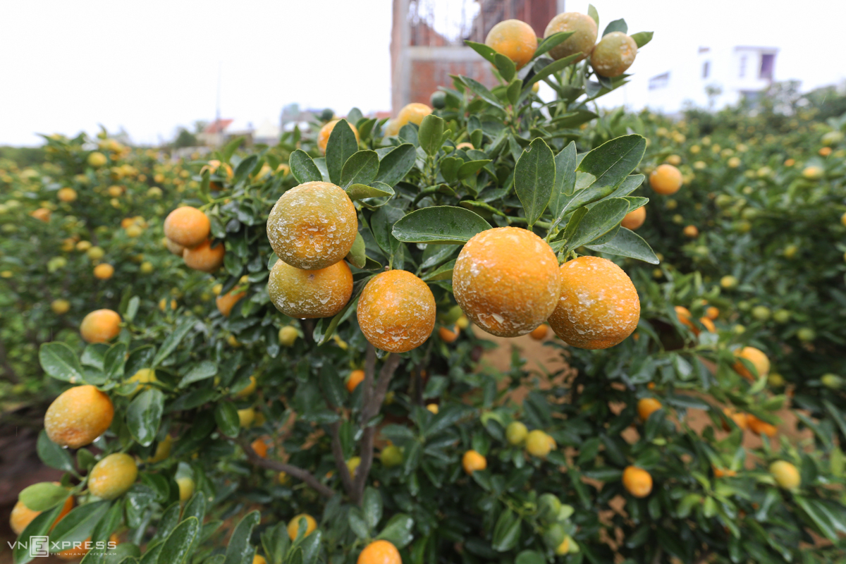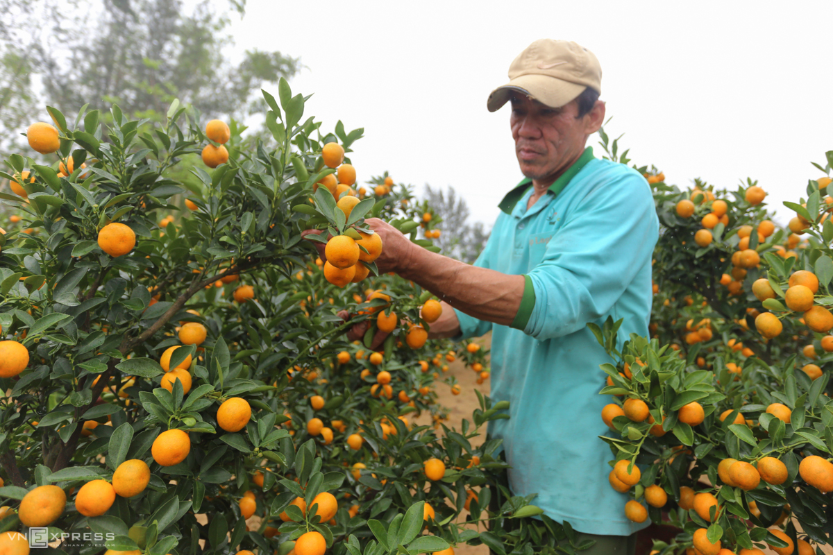 Năm nay, ông Hải trồng 500 chậu, đầu mùa thời tiết thuận lợi, cây được chăm sóc phát triển tốt. Tuy nhiên, cuối mùa hứng chịu bão Molave và nhiều đợt mưa kéo dài. "Thời tiết bất lợi khiến nhiều cây hư hỏng, tôi chọn lọc được 200 cây cho quả đẹp đem bán vào dịp Tết, số còn lại để tiếp tục chăm sóc sang năm bán, một số khác phải nhổ bỏ", chủ vườn nói.