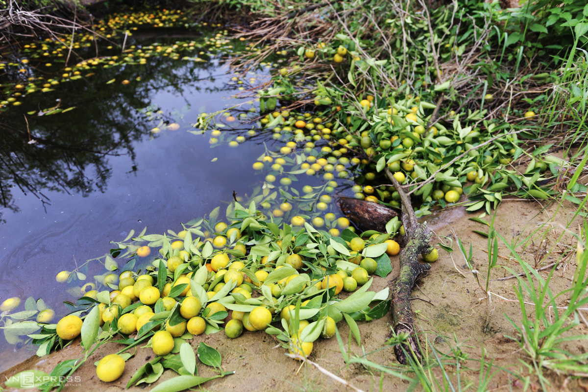 Quả quất bị sâu bệnh, không đạt chất lượng được chủ vườn hái bỏ vứt đầy ruộng.