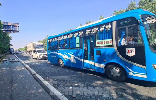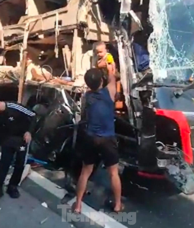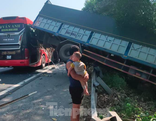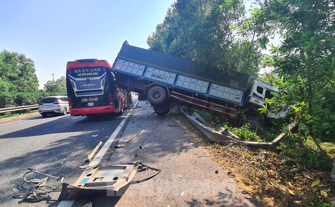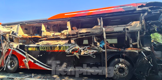 Tại hiện trường, 2 phương tiện hư hỏng nặng. Xe khách bị biến dạng toàn bộ phần thân xe bên phải.