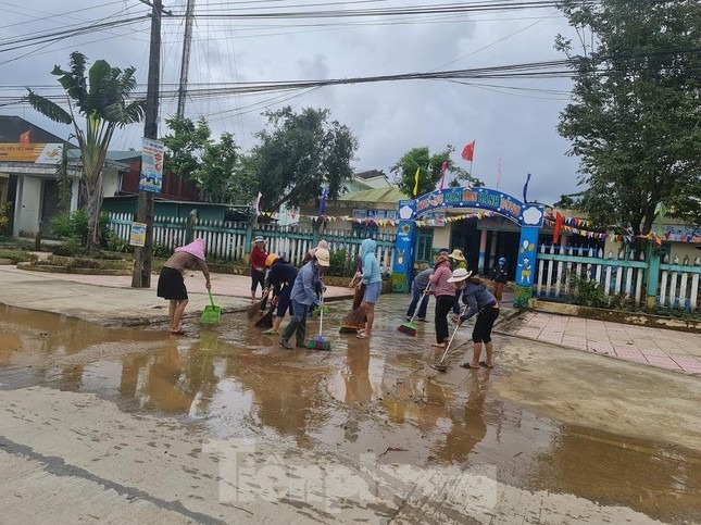 Tại Trường mầm non Hành Dũng, nhiều giáo viên tập trung dọn dẹp bùn non.