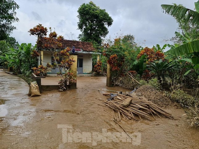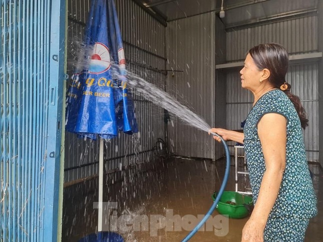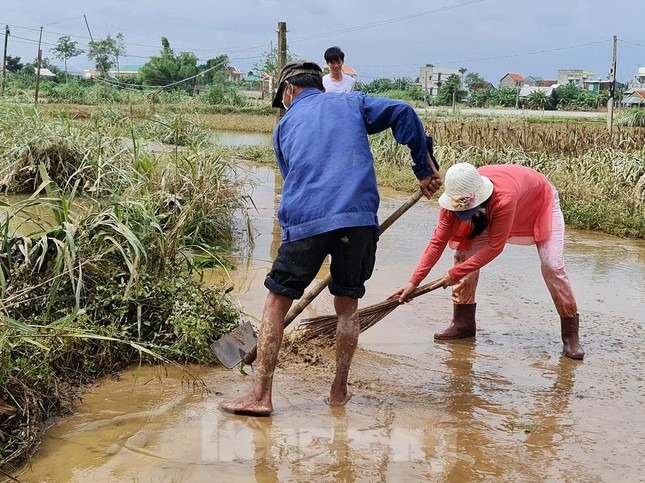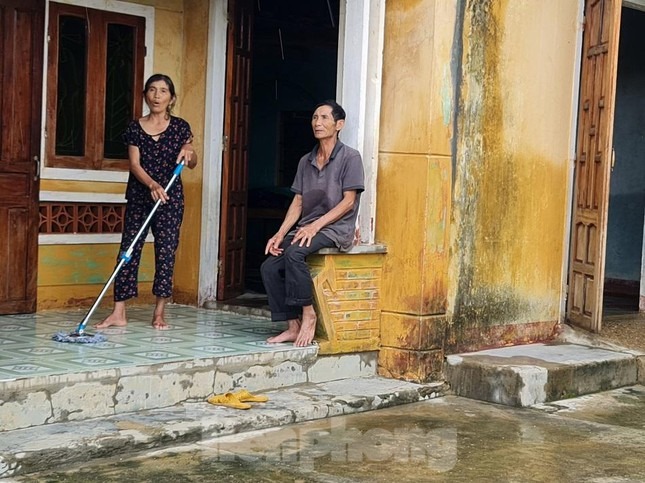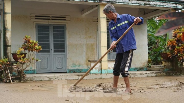 Vợ chồng bà Huỳnh Thị Ninh (71 tuổi) và ông Hồ Văn Hồng (73 tuổi) quét dọn nhà cửa. Ông Hồng cho biết: "Bùn non đóng ngoài sân và trong nhà dày lắm, mất cả đêm chúng tôi mới dọn xong".
