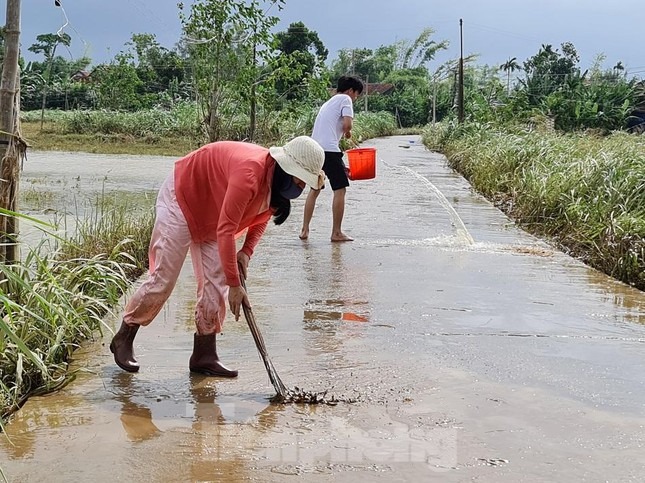 Người dân quét dọn bùn ở những trục đường chính đi vào thôn để tránh tình trạng trơn ngã khi đi đường.
