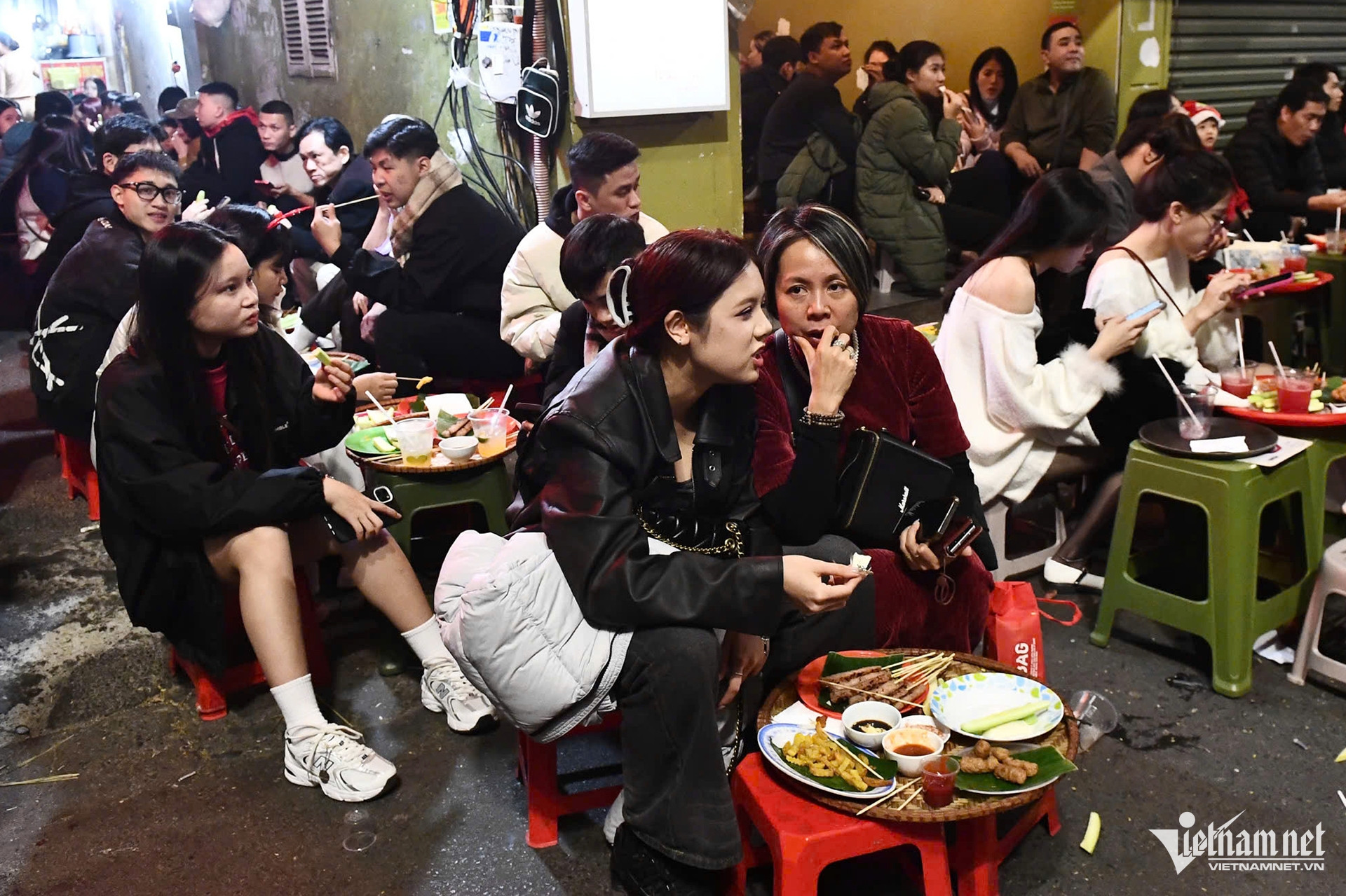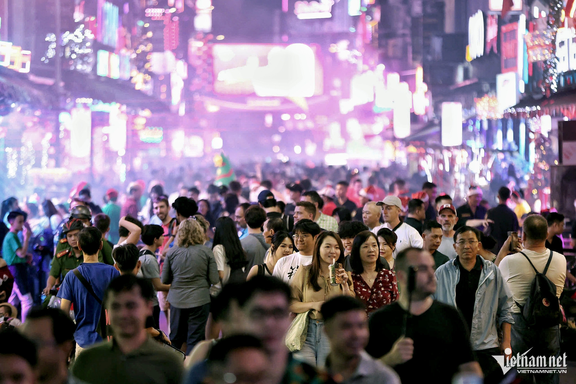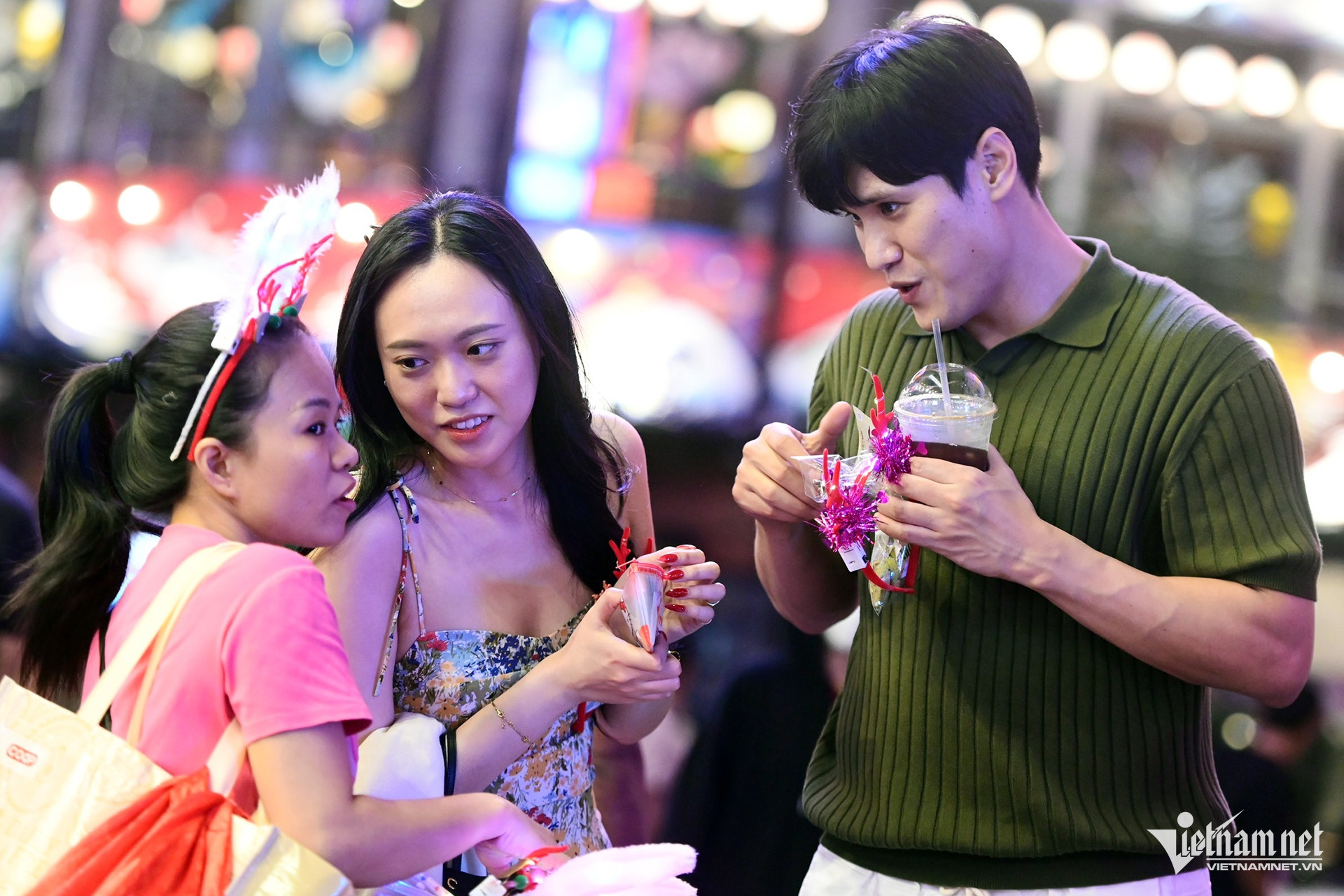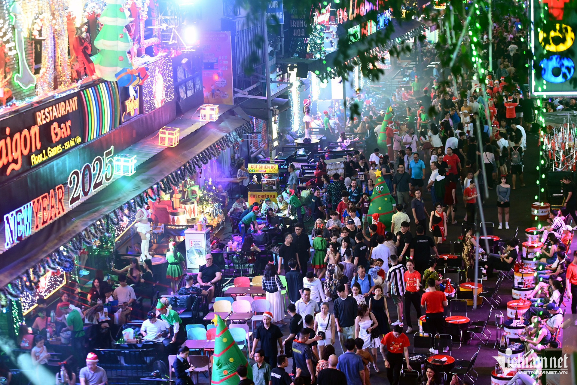 Cảnh tương tự tại phố đi bộ Bùi Viện, nơi tập trung rất nhiều người nước ngoài. Các hàng quán nơi đây đều trang trí rực rỡ tượng trưng cho mùa Giáng sinh, đồng thời để thu hút khách.