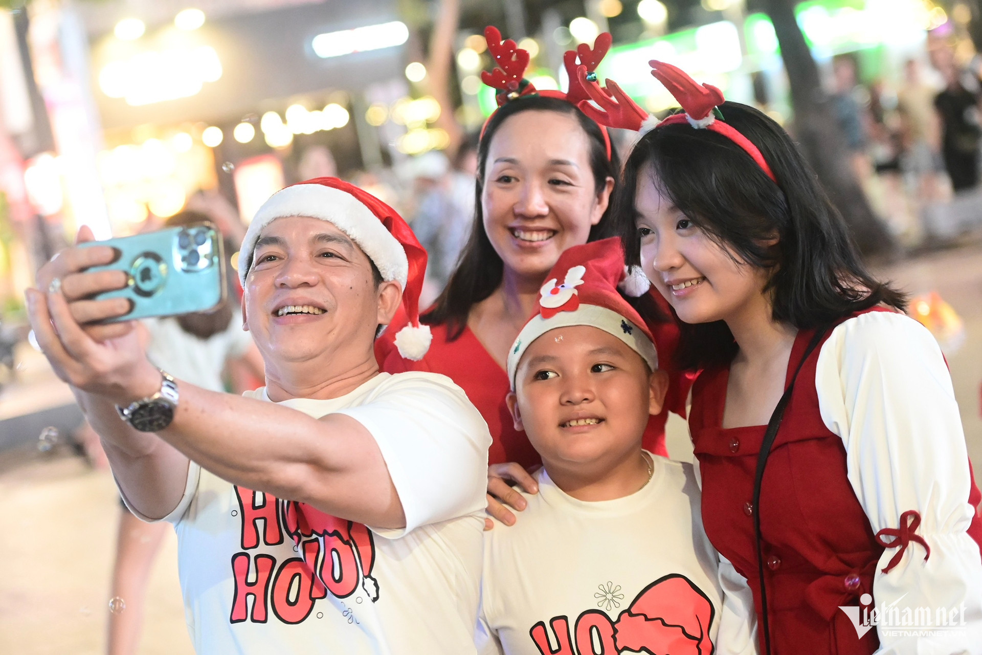Khác với giá lạnh ở Hà Nội, nhiệt độ tại TPHCM là 27 độ C, rất mát mẻ, thuận tiện cho các cuộc vui ngoài đường phố của người dân. Trong ảnh, gia đình chị Lahly (Pháp) đi du lịch đúng dịp này và đã được hòa mình vào không khí Giáng sinh tại Việt Nam.