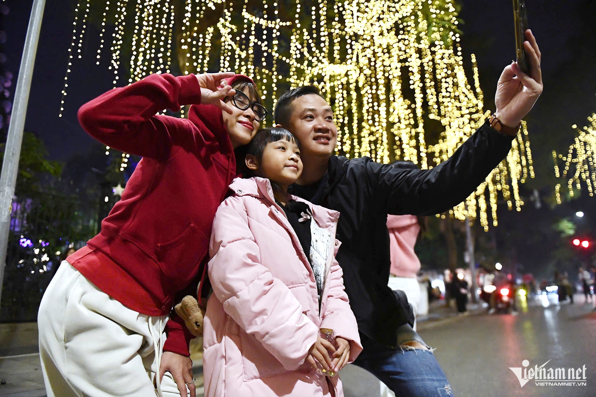 Gia đình chị Quỳnh Anh (ở quận Hoàng Mai) sắp xếp đi chơi Noel từ 18h. “Vì ngày lễ, sợ đông người nên vợ chồng tôi phải đi sớm cho đỡ tắc. Hôm nay là ngày giữa tuần nên chúng tôi chủ động về sớm nấu cơm rồi tới đây tận hưởng không khí”, chị Quỳnh Anh nói.