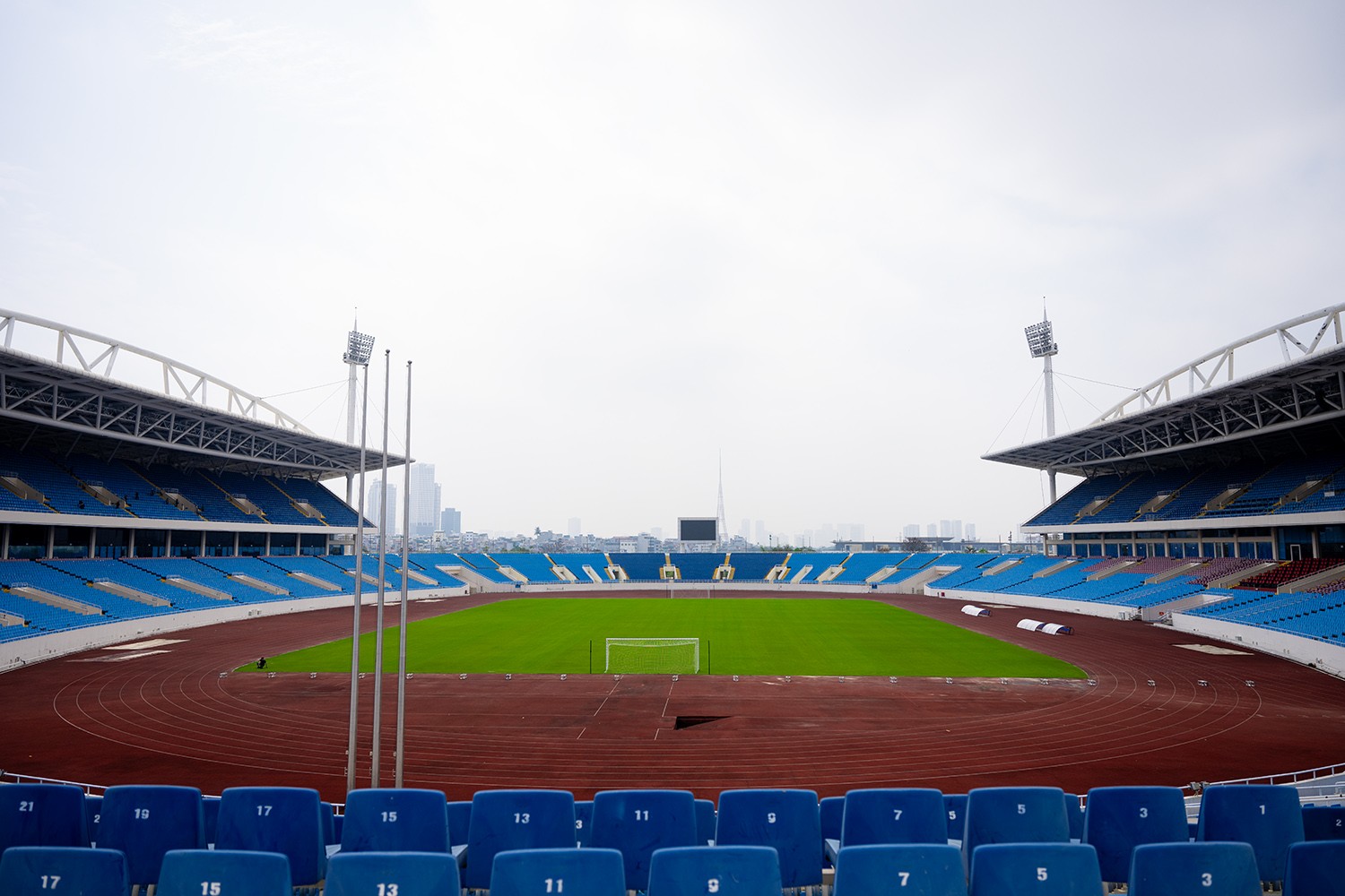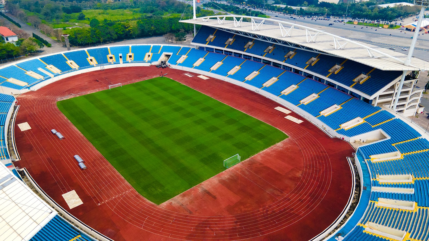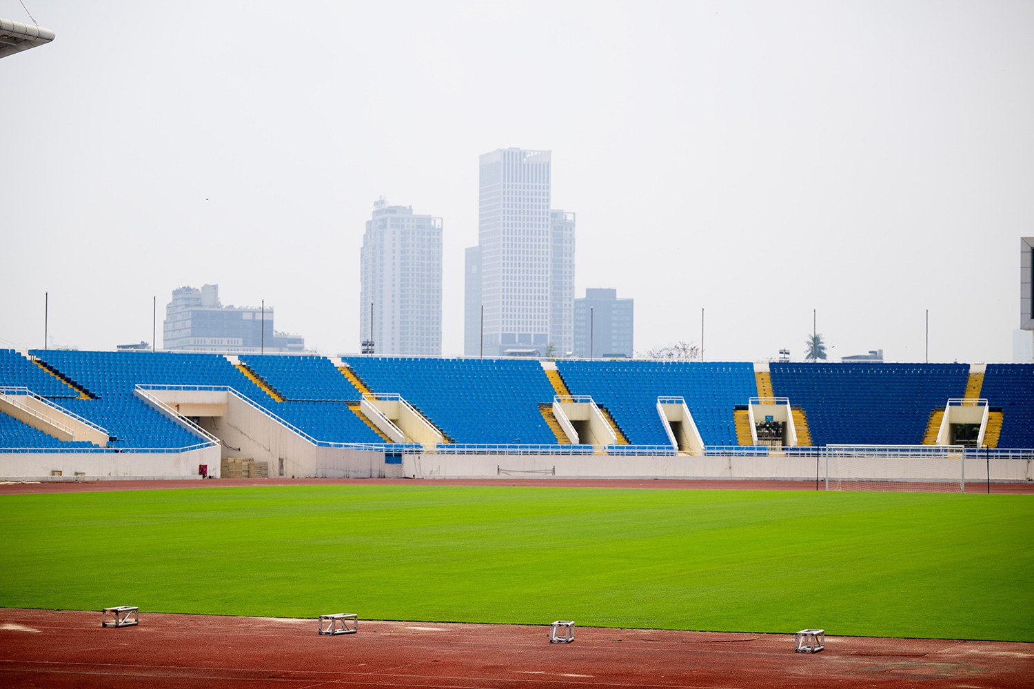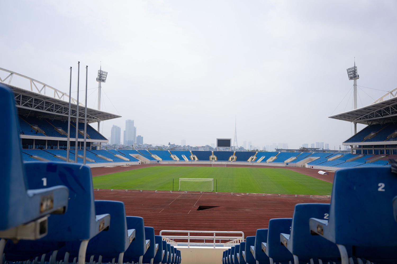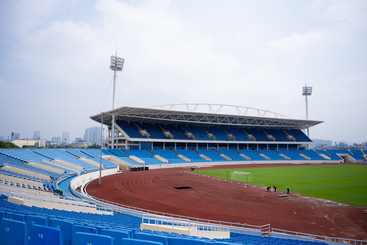 Mặt cỏ sân Mỹ Đình được chăm sóc tốt trong thời gian gần đây, chuẩn bị cho trận đấu giữa Việt Nam và Indonesia.