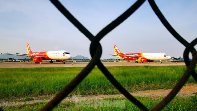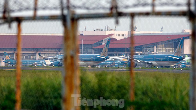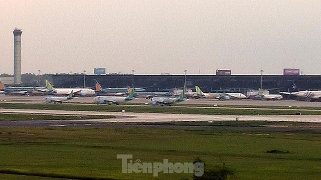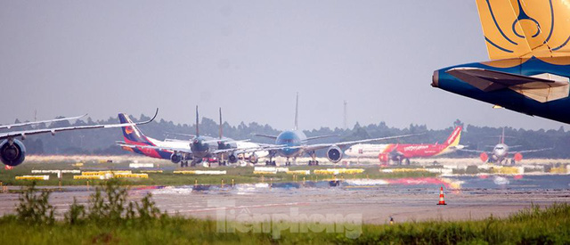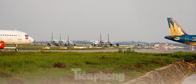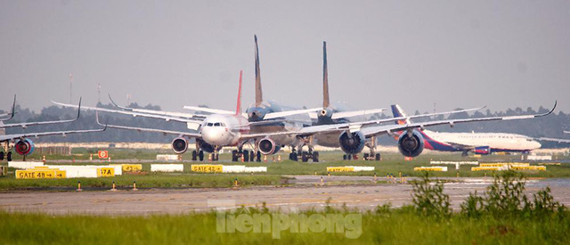 Đại dịch COVID -19 làm các đường bay quốc tế và nội địa dừng hoạt động gần hết. Máy bay hạ cánh dồn về nằm chờ kín đường lăn tại sân bay Nội Bài.