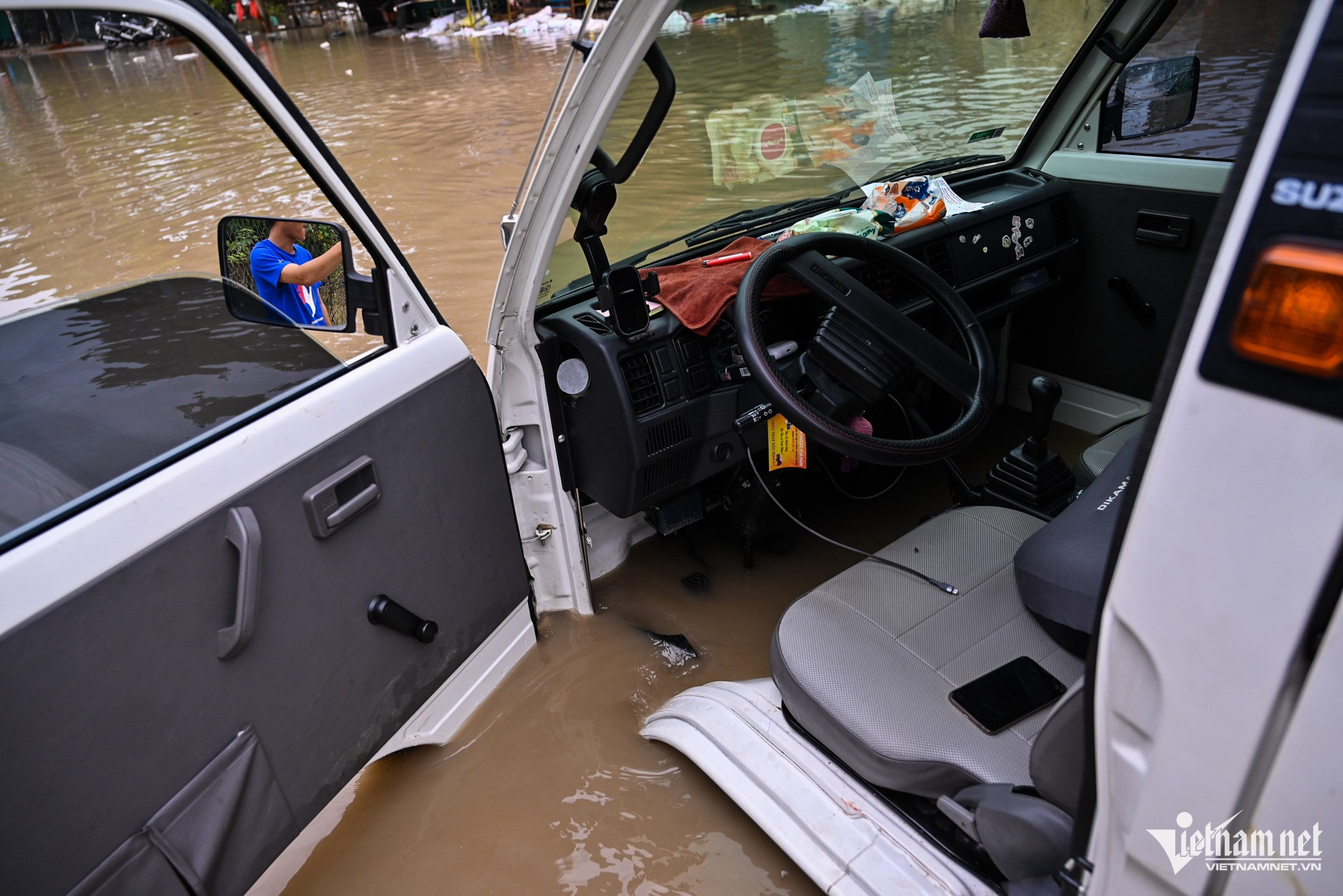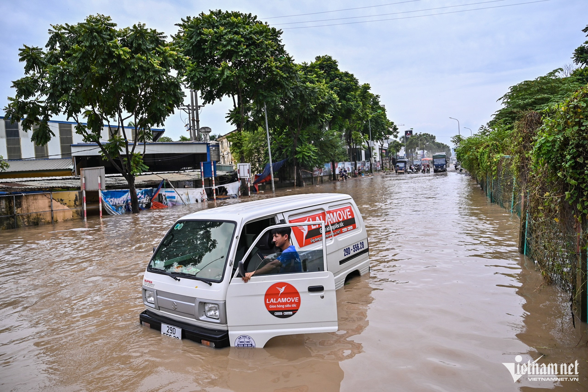 Những người qua lại khu vực Km6 đại lộ Thăng Long (Hoài Đức, Hà Nội) đang phải chịu cảnh ngập lụt kéo dài tới ngày thứ 5, nhà xưởng chìm trong biển nước, phương tiện chết máy hàng loạt khi cố lưu thông.