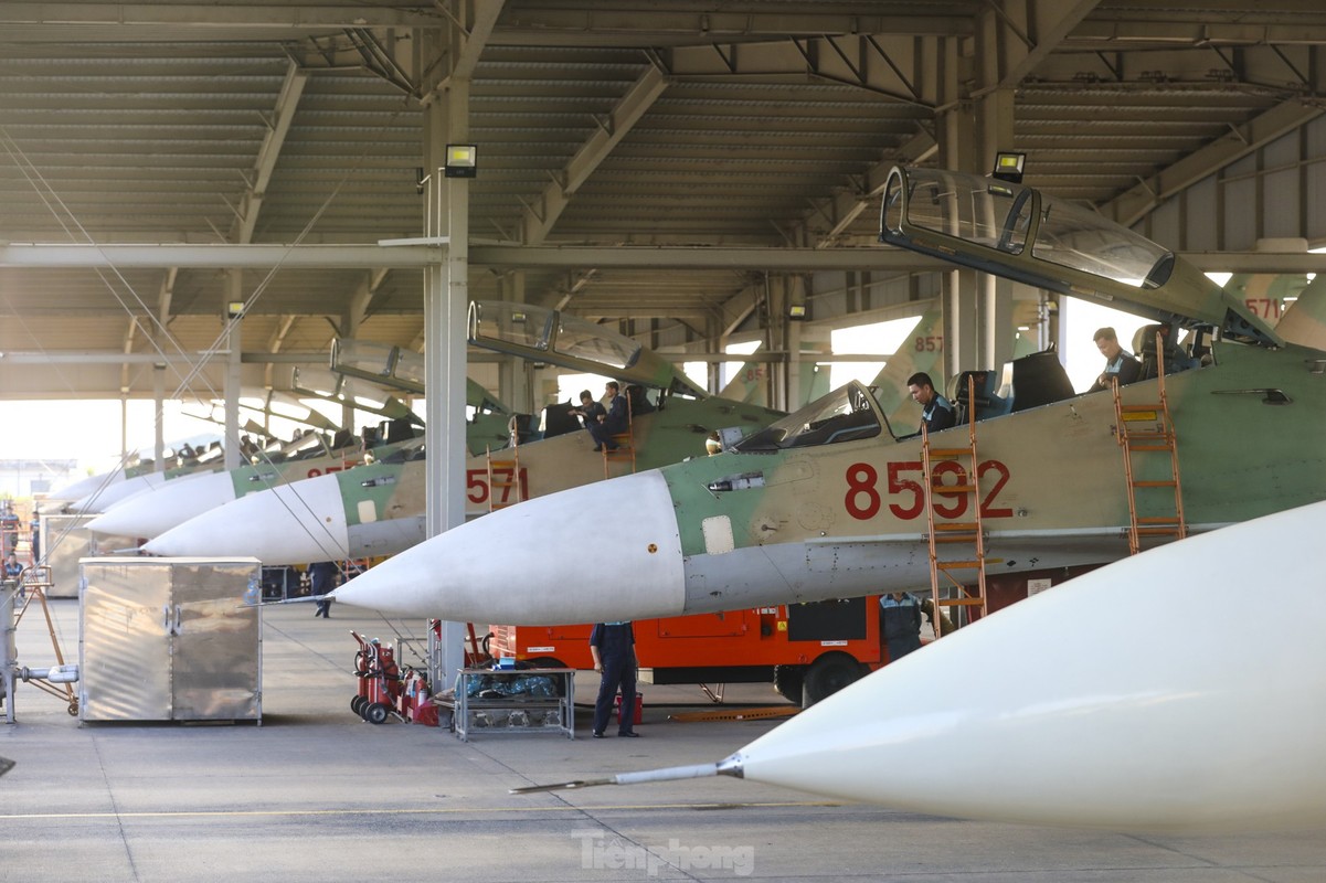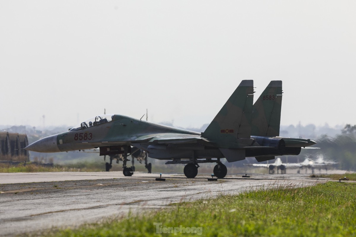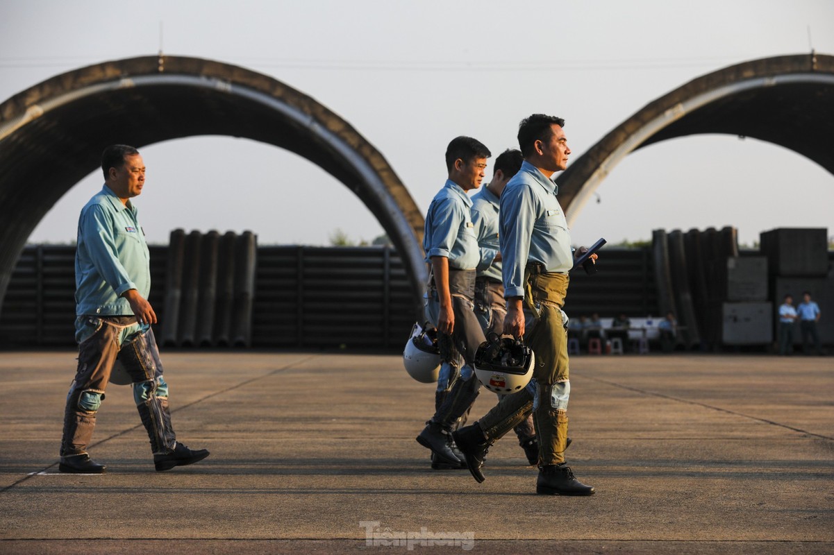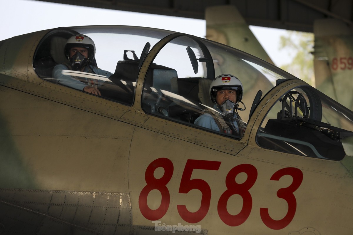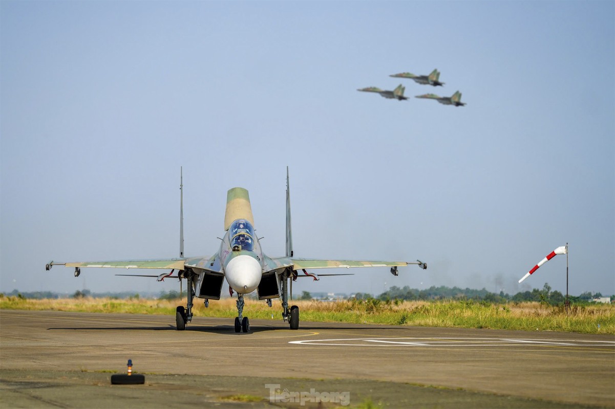 Các phi công cất, hạ cánh tiêm kích bốn lần trong một buổi sáng, tập ghép đội hình, nhào lộn kỹ thuật phức tạp để chuẩn bị trình diễn dịp lễ 30/4.