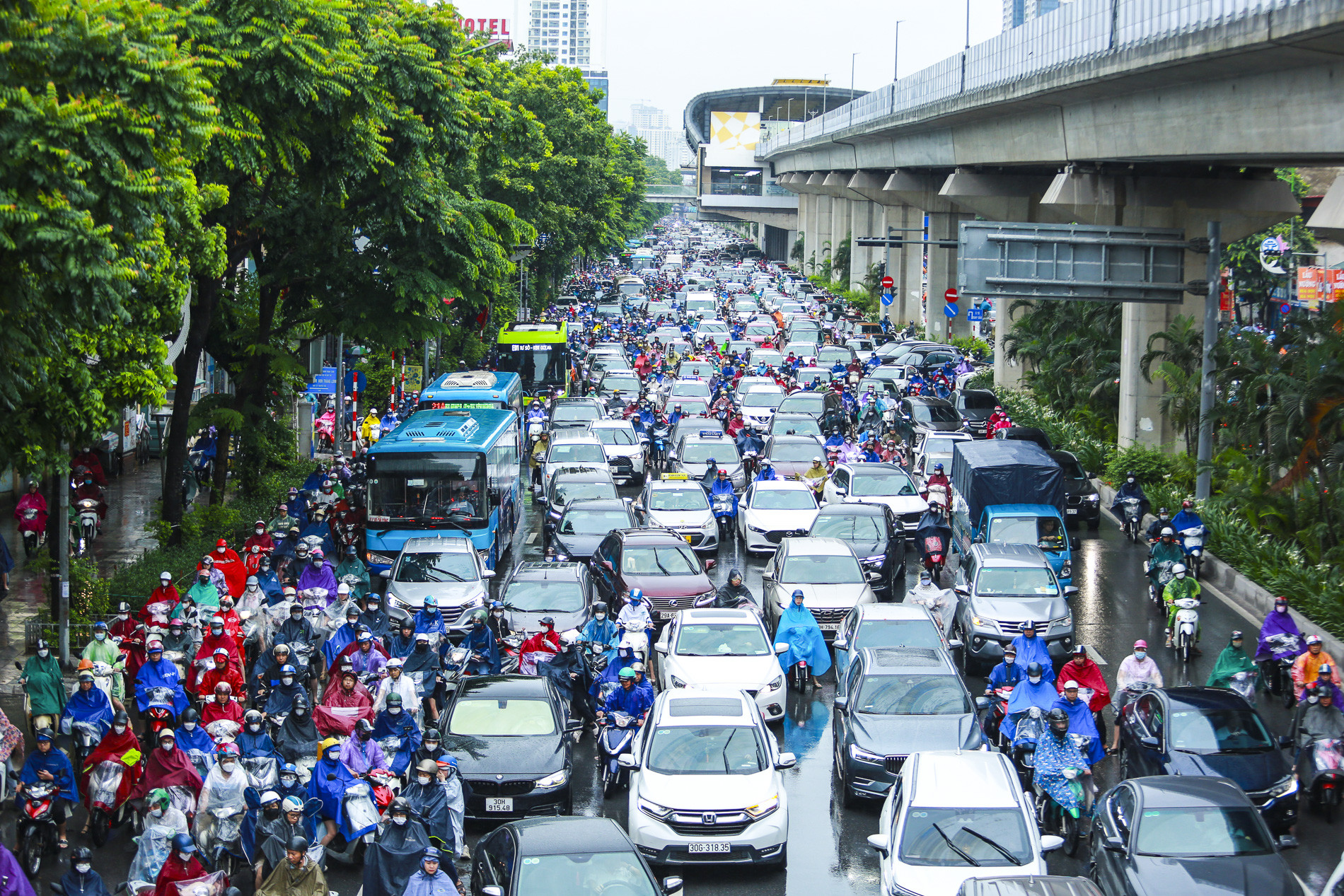 Cơn mưa lớn vào giờ cao điểm buổi sáng đầu tuần kéo dài hàng giờ khiến nhiều tuyến phố rơi vào tình trạng ùn tắc nghiêm trọng.