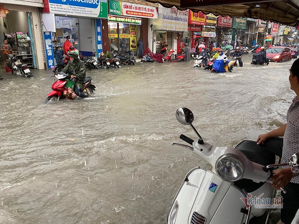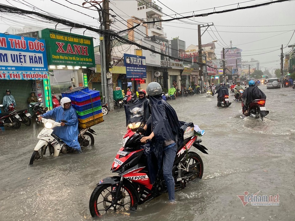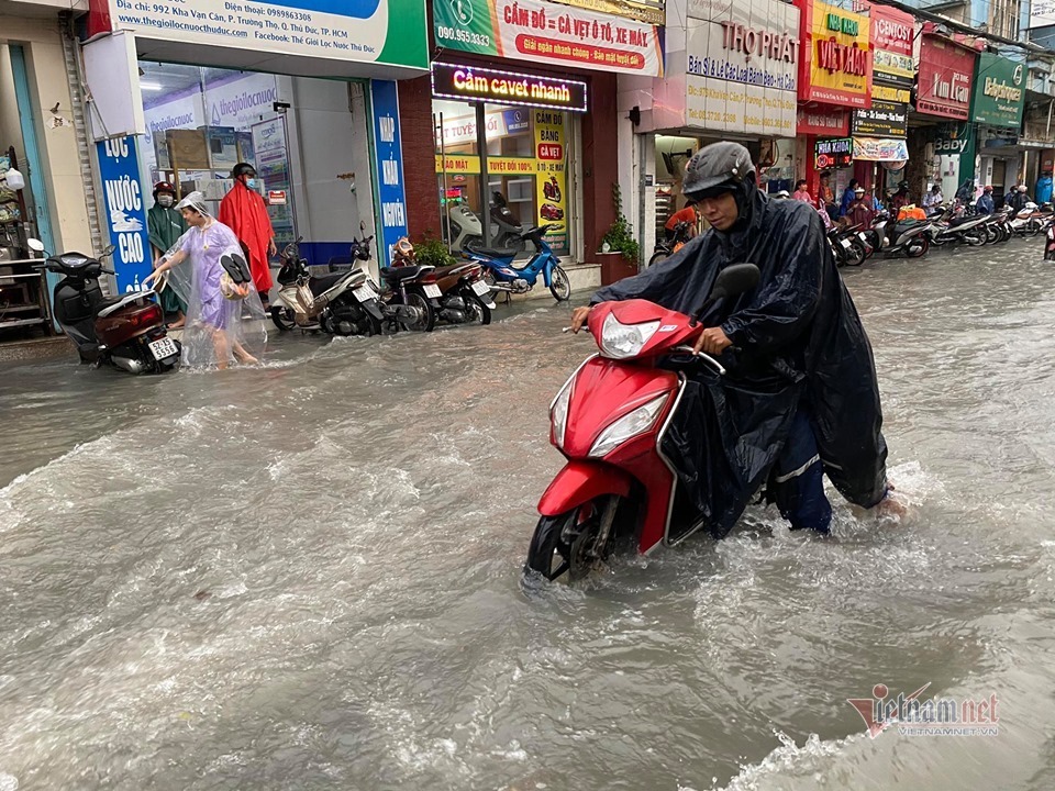 Tại quận Thủ Đức, nhiều tuyến đường ngập sâu như: Kha Vạn Cân, Võ Văn Ngân, Lê Văn Ninh, Dương Văn Cam…