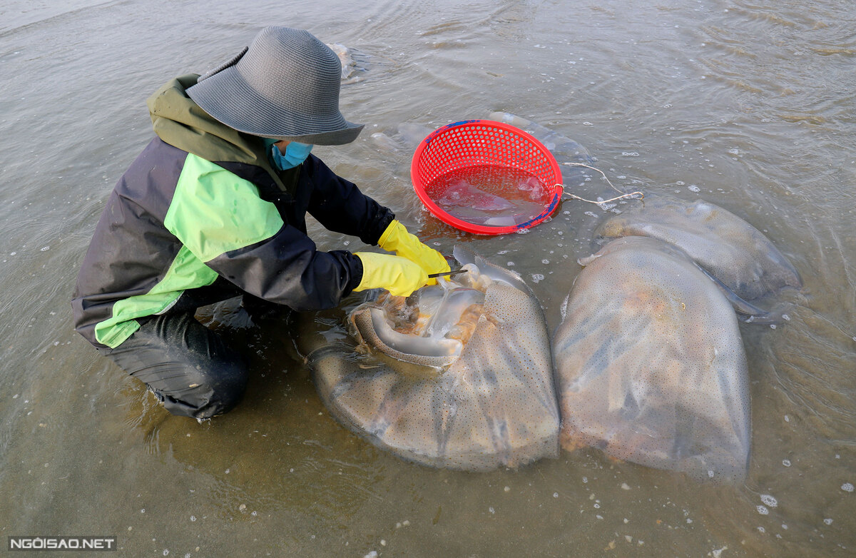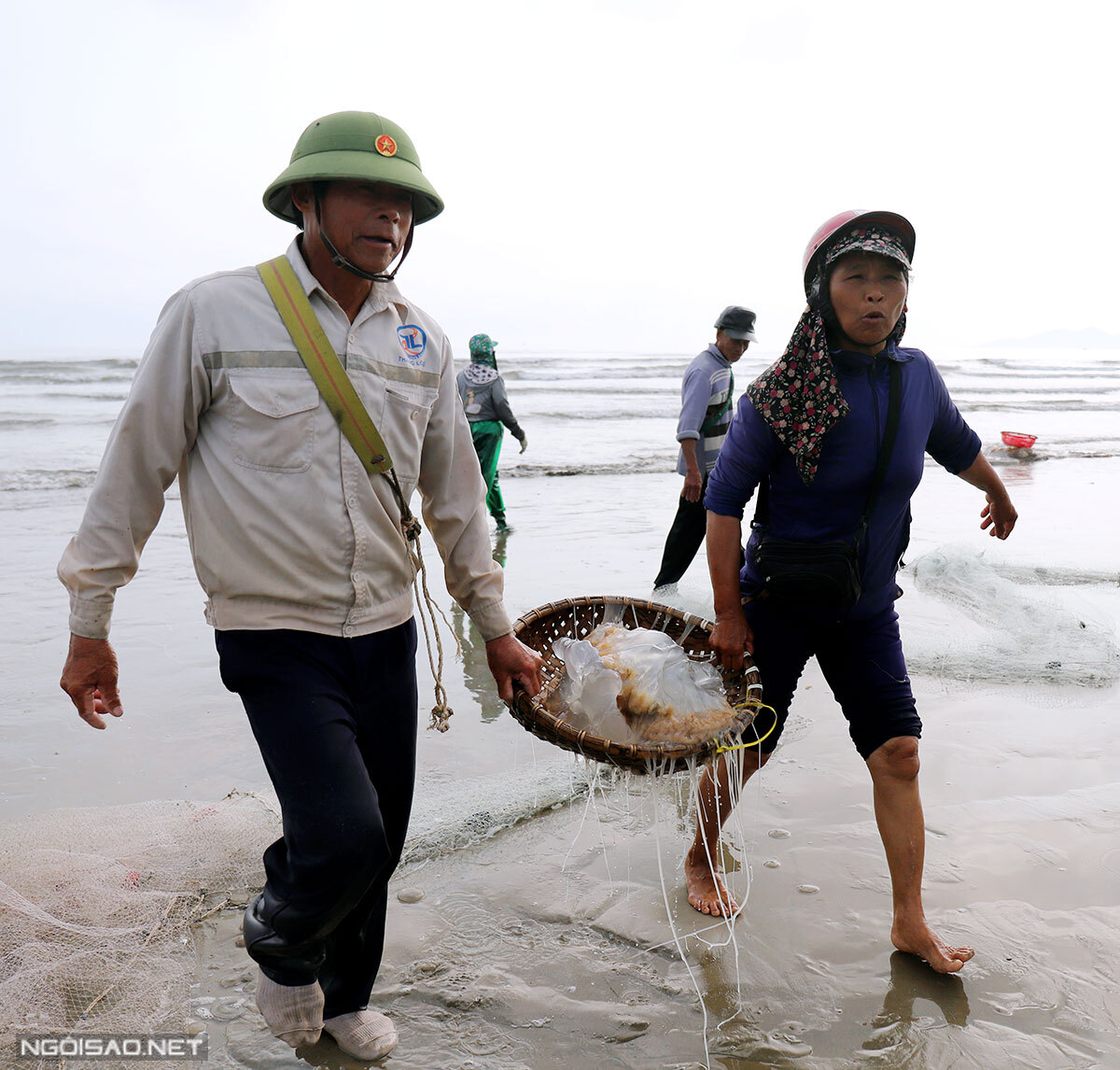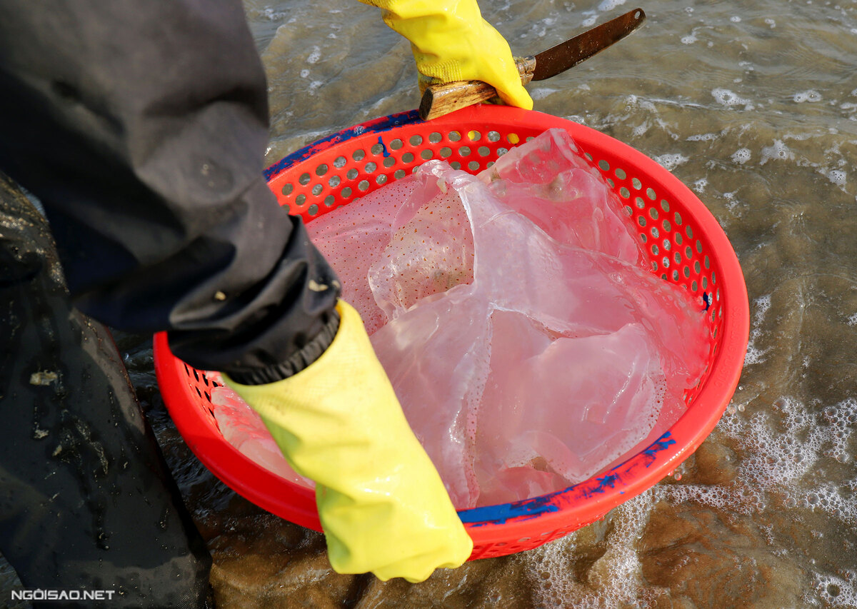 Một số ngư dân dùng rổ, rá, vớt những con sứa đang nổi trên mặt nước, cách bờ khoảng 300 m đưa vào trong. Một con sứa sống nặng từ 5 đến 50 kg, nhiều con nặng 60-70 kg.