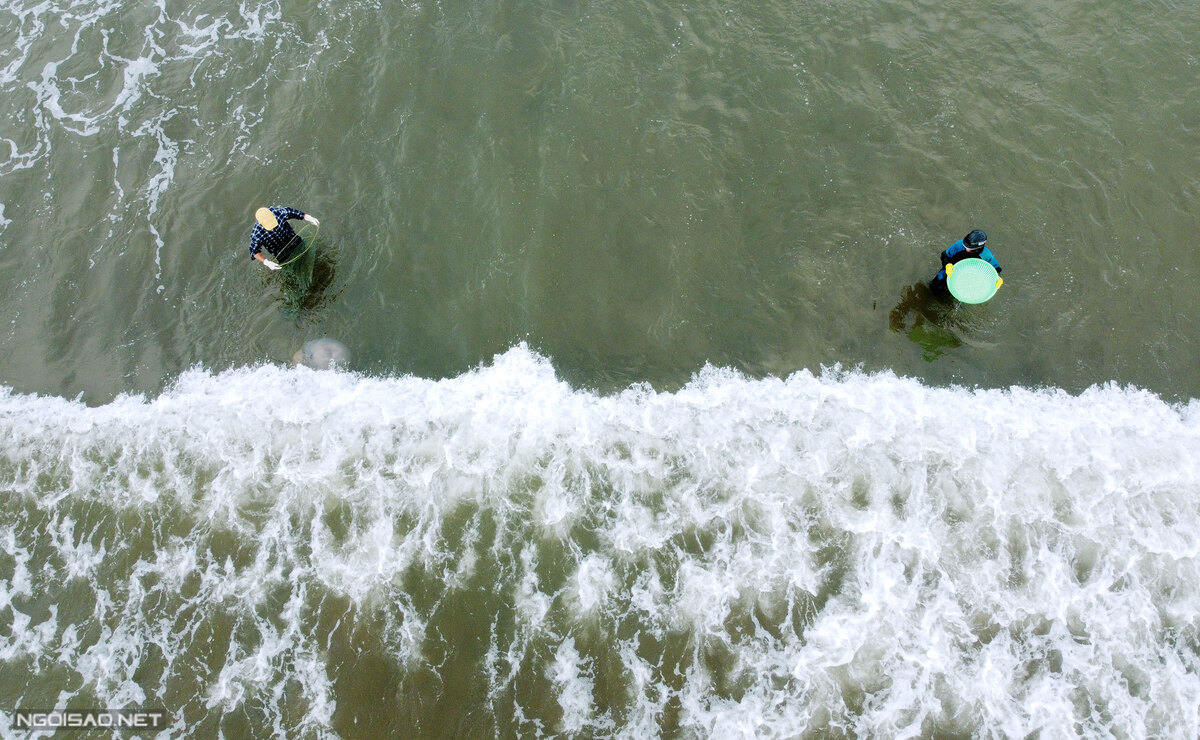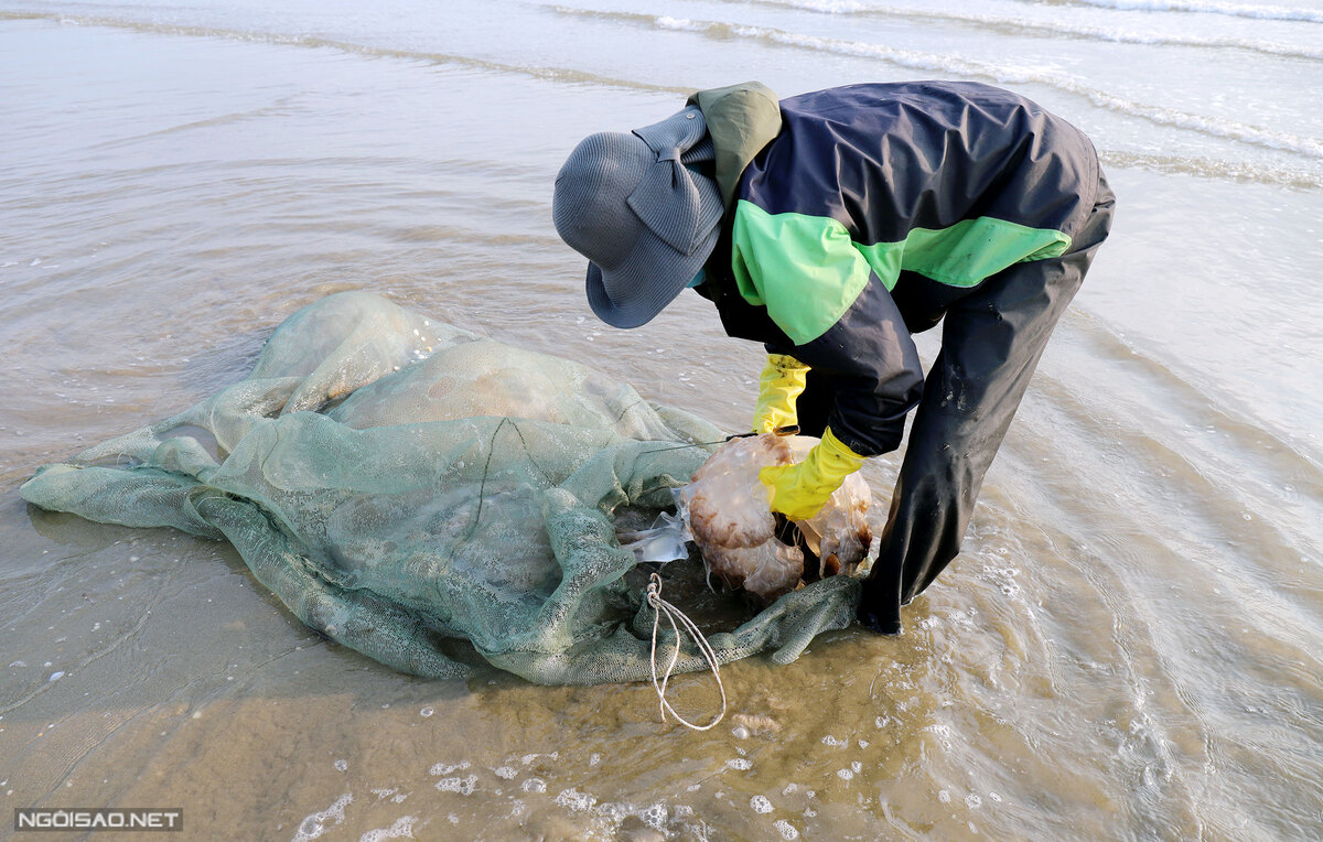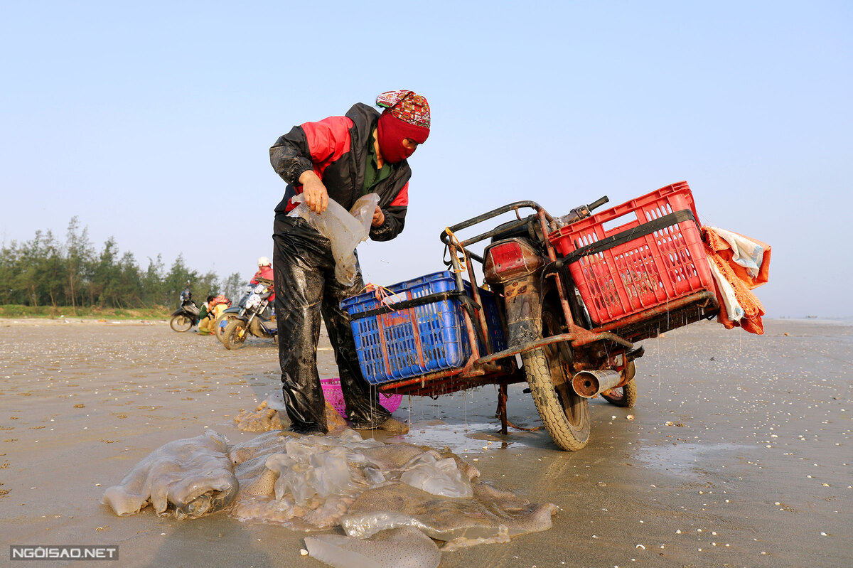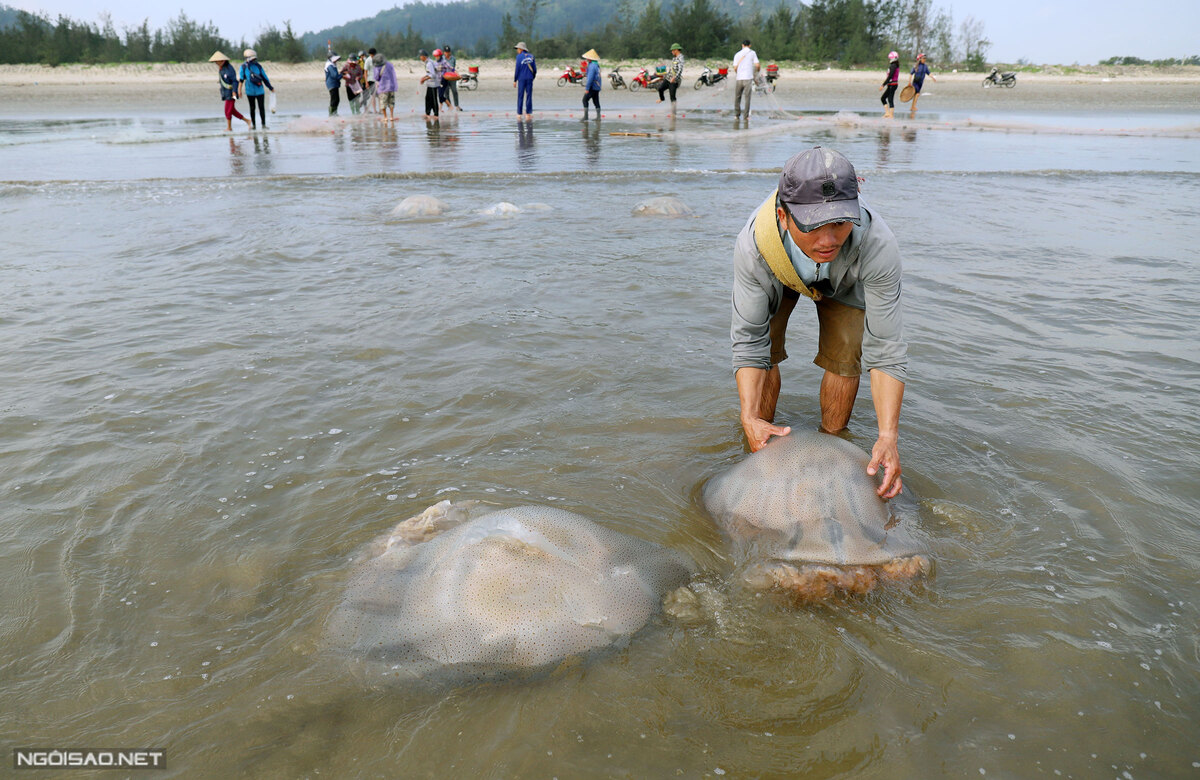 Một số ngư dân dùng rổ, rá, vớt những con sứa đang nổi trên mặt nước, cách bờ khoảng 300 m đưa vào trong. Một con sứa sống nặng từ 5 đến 50 kg, nhiều con nặng 60-70 kg.