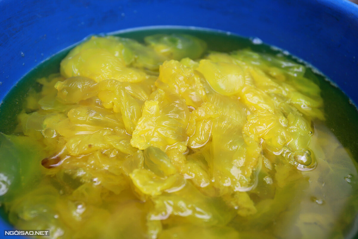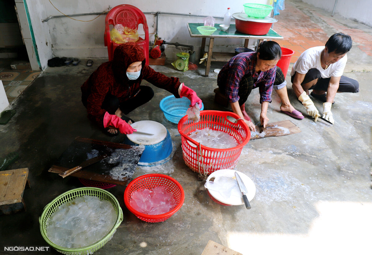 Sứa đưa về được rửa sạch, người dân tiếp tục dùng dao nhỏ bóc tách các lớp nhờn và nội tạng còn sót, sau đó đặt lên thớt cắt thành miếng dài 20 cm, rộng 10 cm bỏ vào âu nhựa. Một tấn sứa khi làm sạch còn 500-600 kg.
