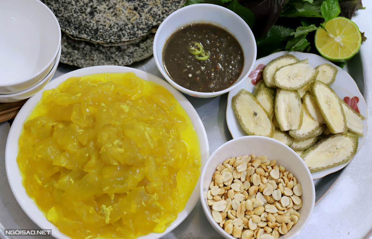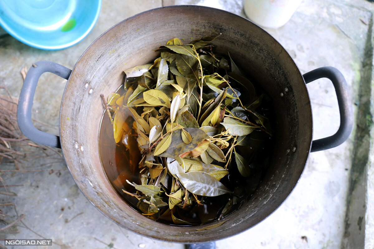 Nước lá dung, lá sim nguội được đổ nước vào các xô nhựa để sẵn sứa bên trong, rồi ngâm cho ra màu xanh. Một lần ngâm khoảng 2 tiếng.