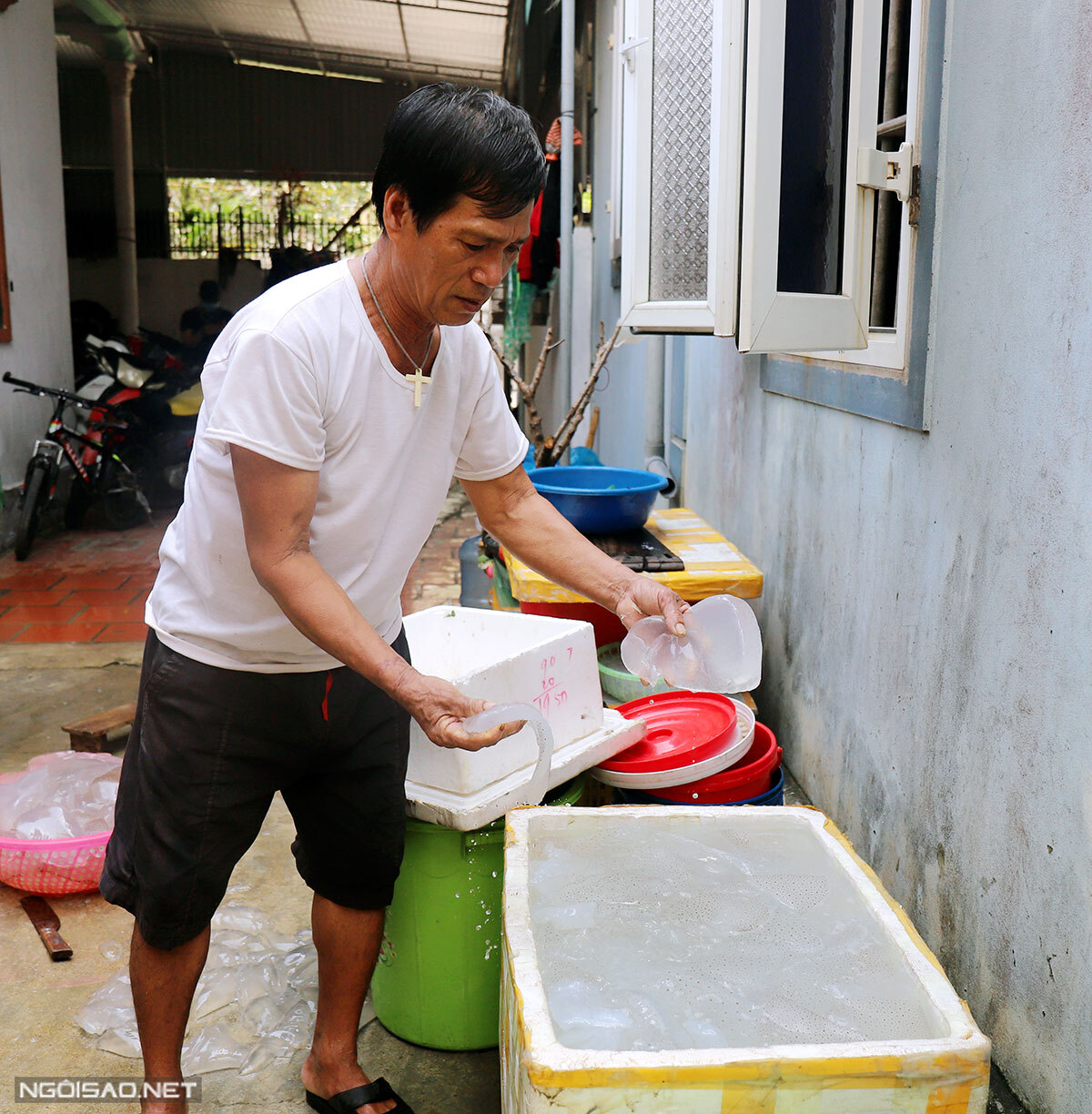 "Hàng ngày, tôi ra khơi từ lúc 6h, kéo khoảng ba mẻ sứa, đầu giờ chiều thì nghỉ. Trung bình mỗi ngày bắt khoảng 5 tạ sứa, hôm may mắn được 7 tạ, nhưng hôm biển động không được con nào", ông Nguyễn Thành Đô (55 tuổi, trú xã Thịnh Lộc, huyện Lộc Hà), nói.