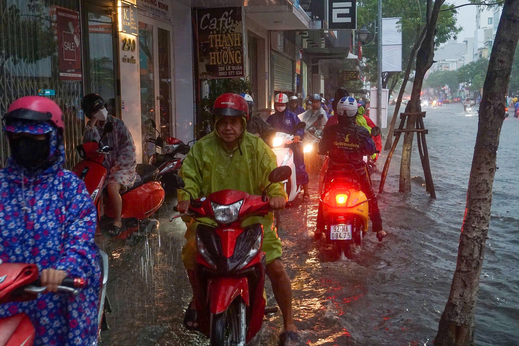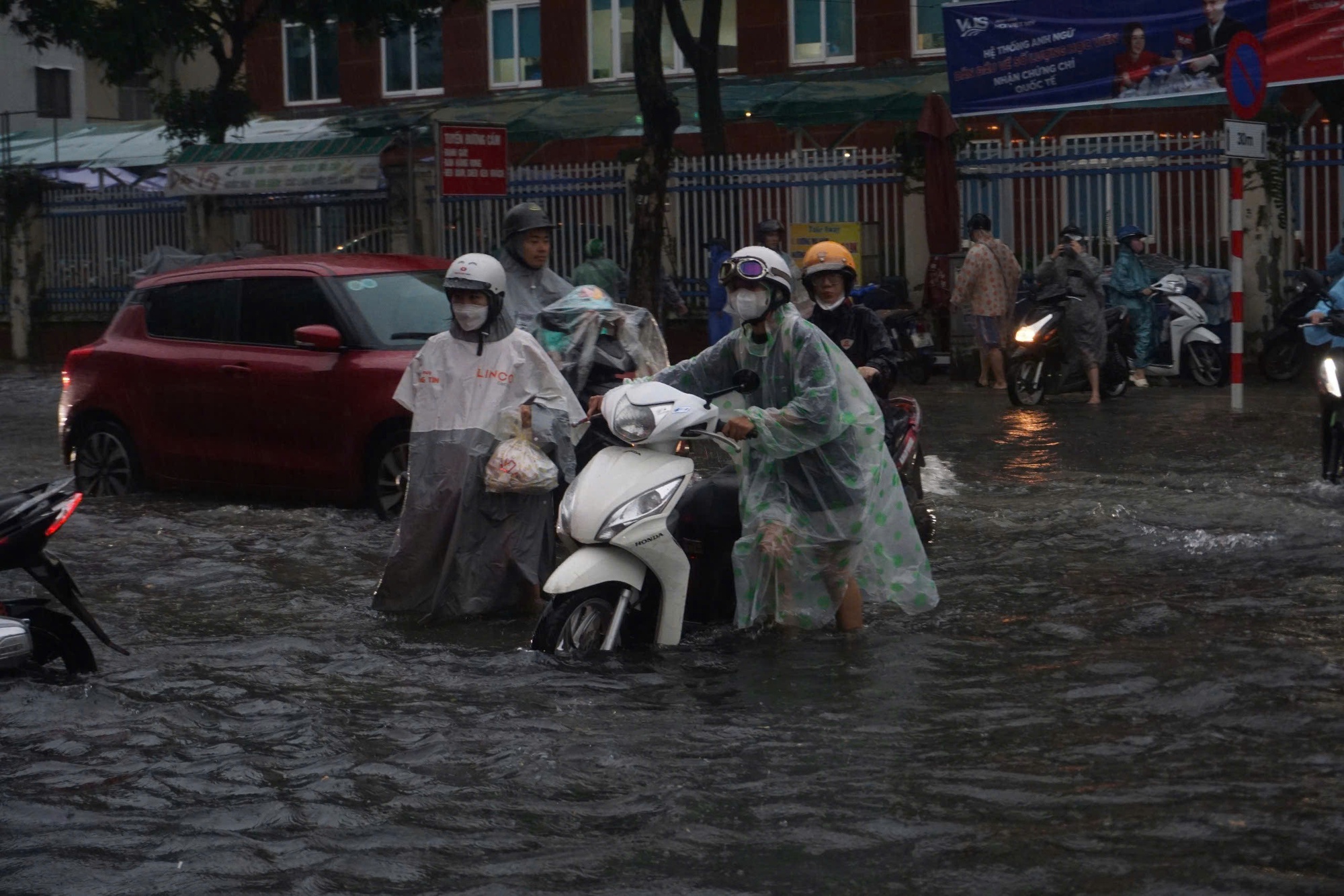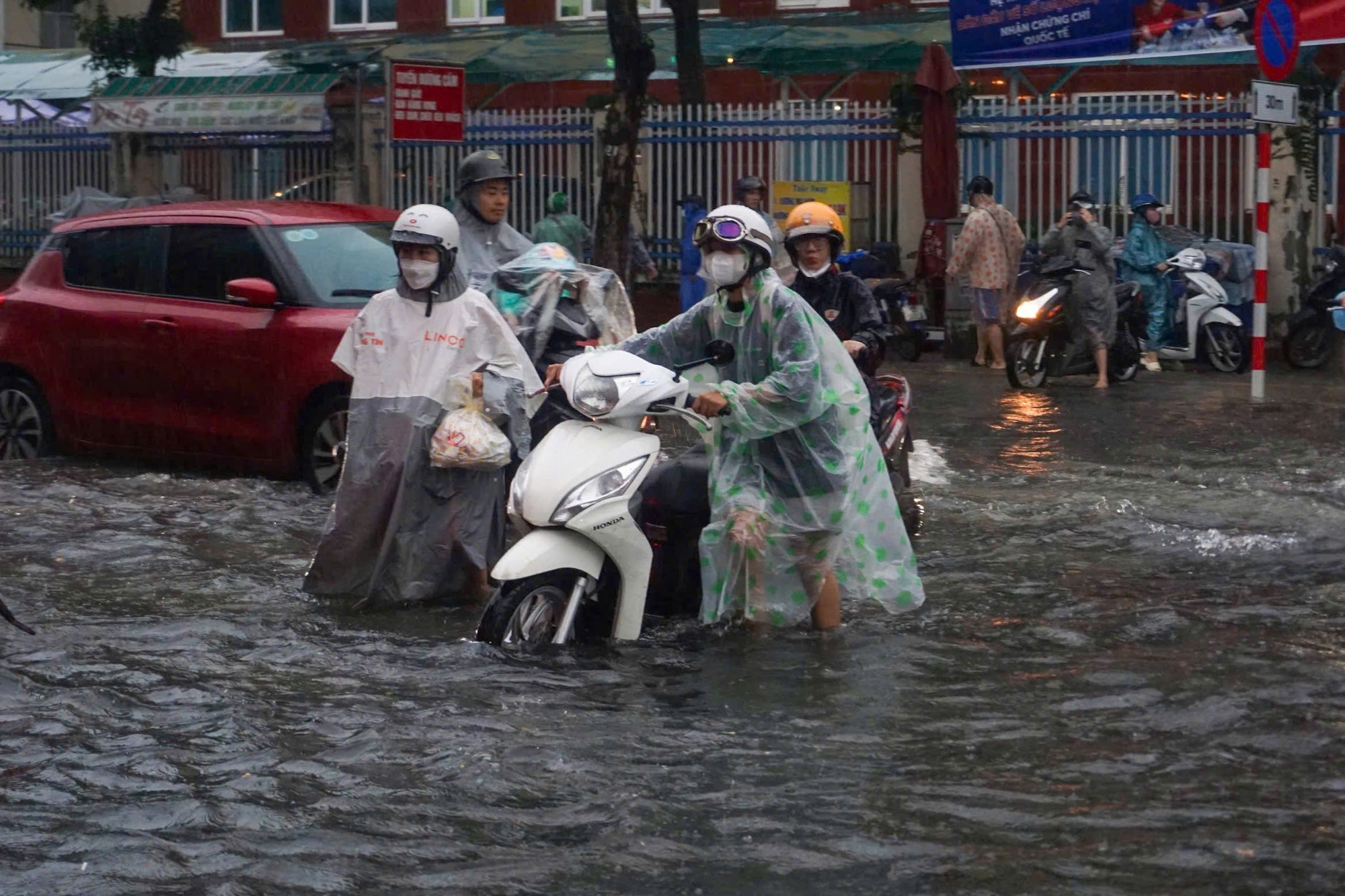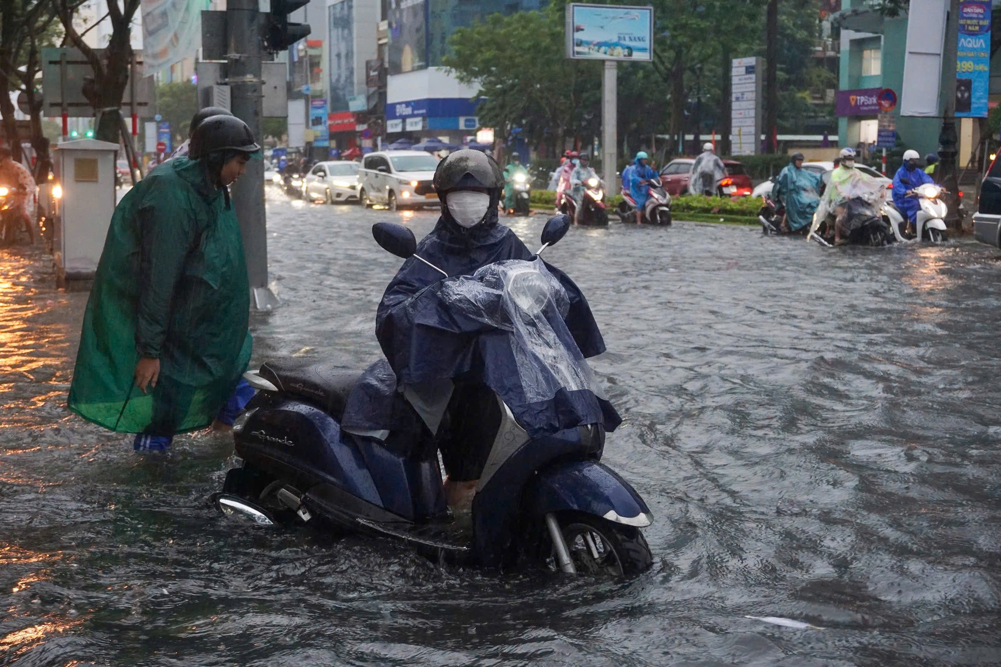 Trận mưa lớn sáng 18/9 khiến khiến nhiều tuyến phố Đà Nẵng bị ngập cục bộ, hàng loạt phương tiện bị chết máy giữa đường khiến người dân phải bì bõm dắt bộ.