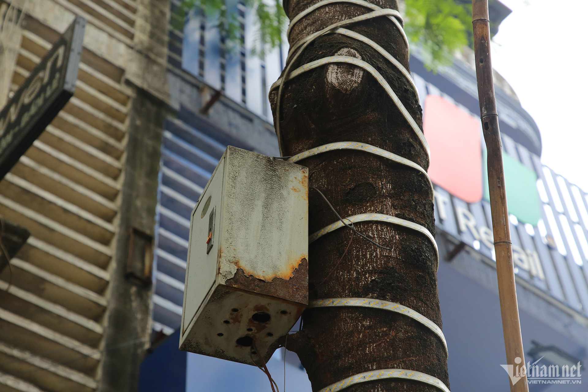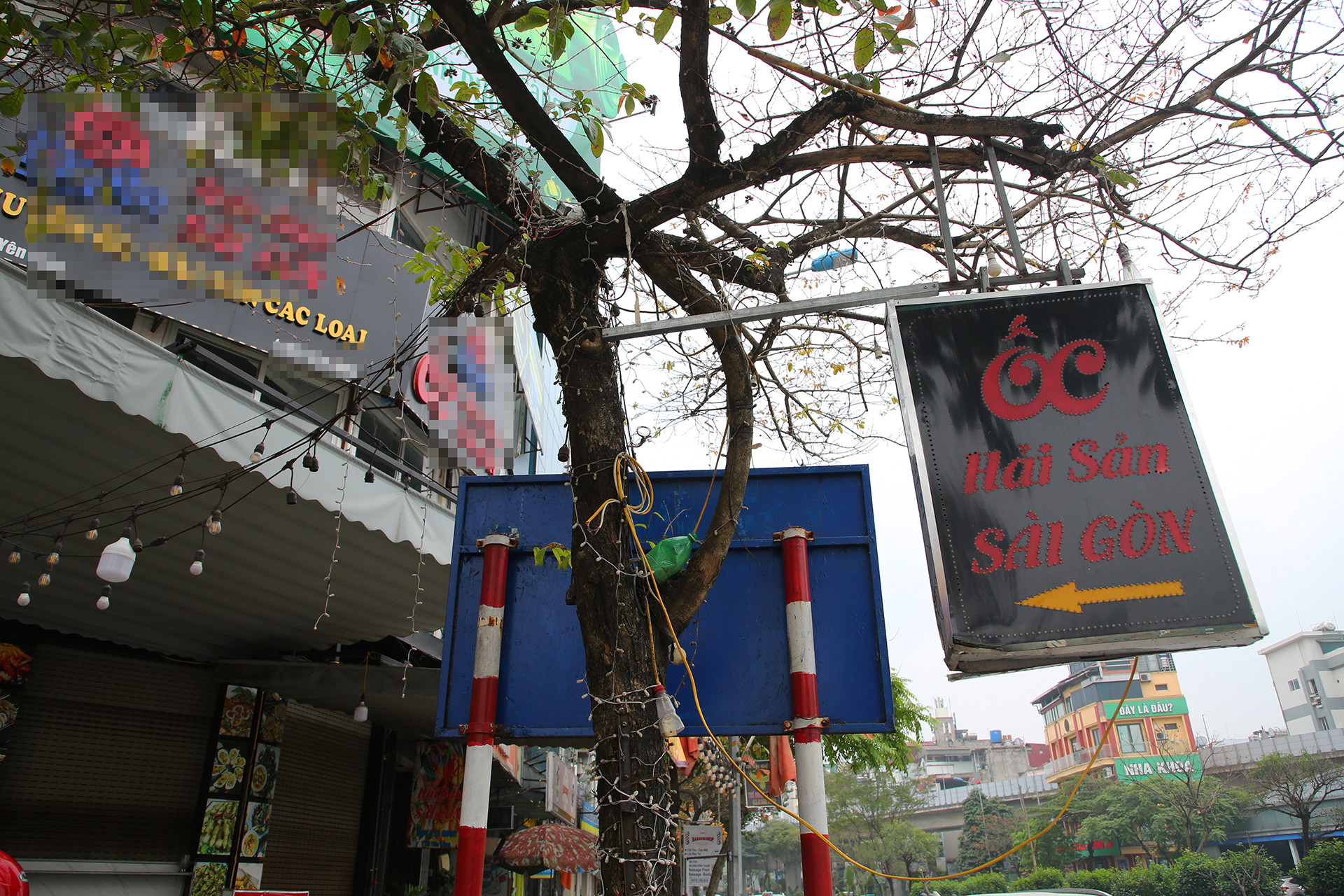 Tình trạng tương tự cũng xảy ra tại phố Thái Thịnh (quận Đống Đa), các cửa hàng không chỉ treo biển quảng cáo mà còn mắc cả dây đèn trang trí, lắp camera an ninh, tủ điện... lên thân cây.
