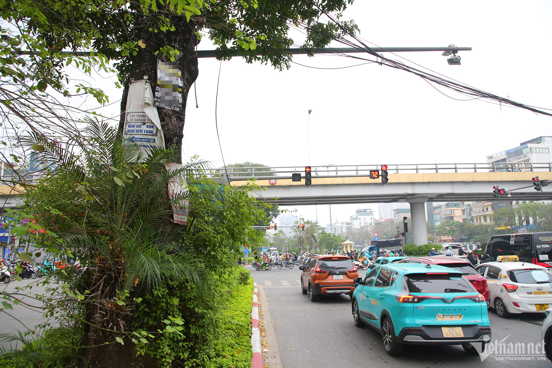 Hàng xà cừ dọc đường Láng cũng bị biến thành "cột quảng cáo" bất đắc dĩ. Một cây xà cừ tại nút giao đường Láng - Lê Văn Lương bị treo đến 10 biển quảng cáo.