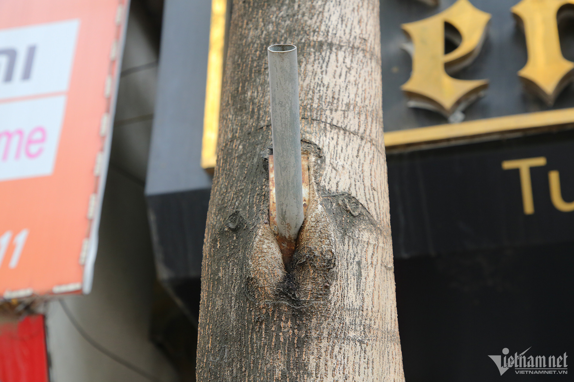 Sau vụ việc 3 cây sao đen trăm tuổi bị chết tại phố Lò Đúc, PV VietNamNet ghi nhận trên nhiều tuyến phố ở Hà Nội có tình trạng cây xanh bị "bức tử" bằng việc đóng đinh, mắc đèn, treo biển quảng cáo hay đổ bê tông bịt kín gốc...