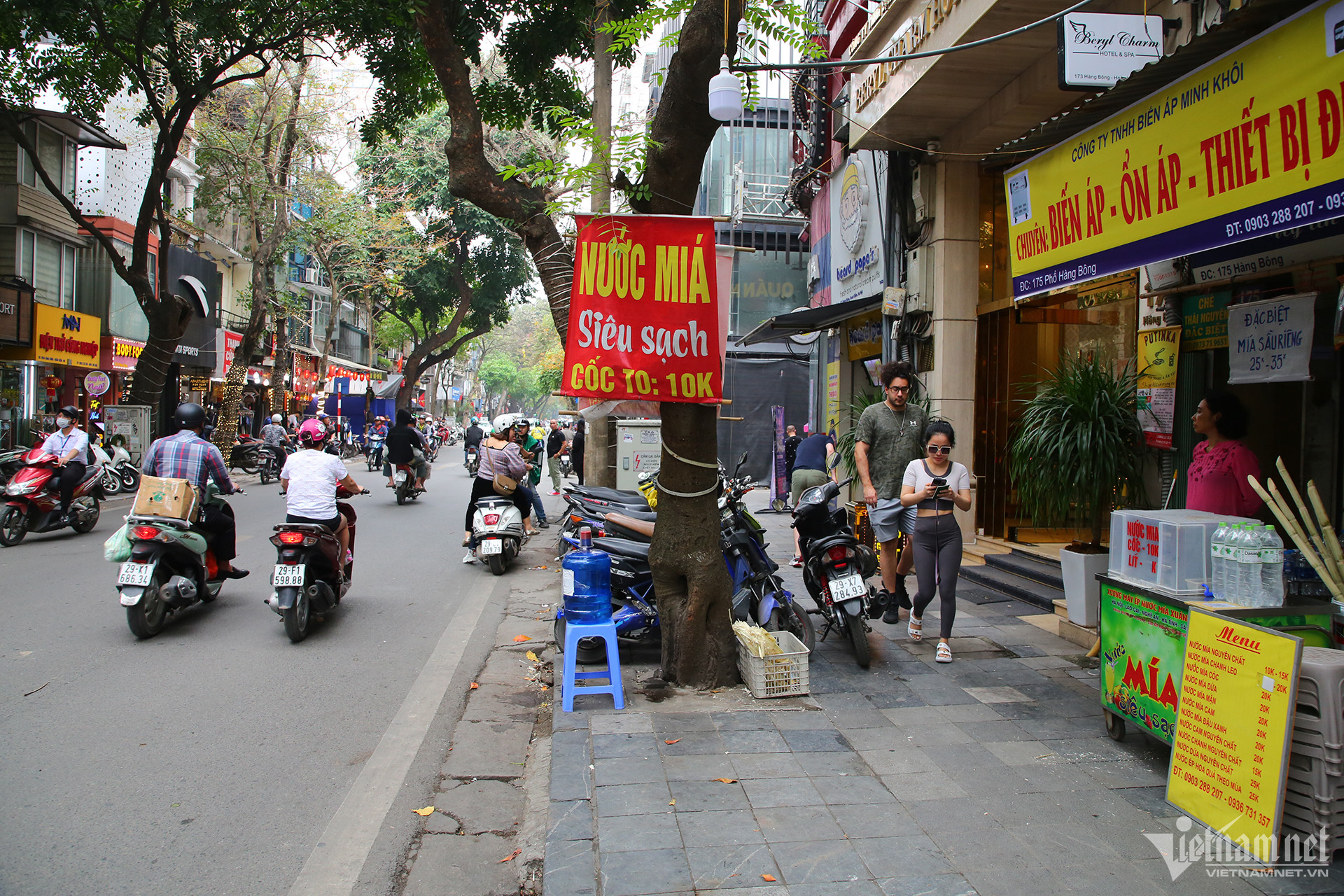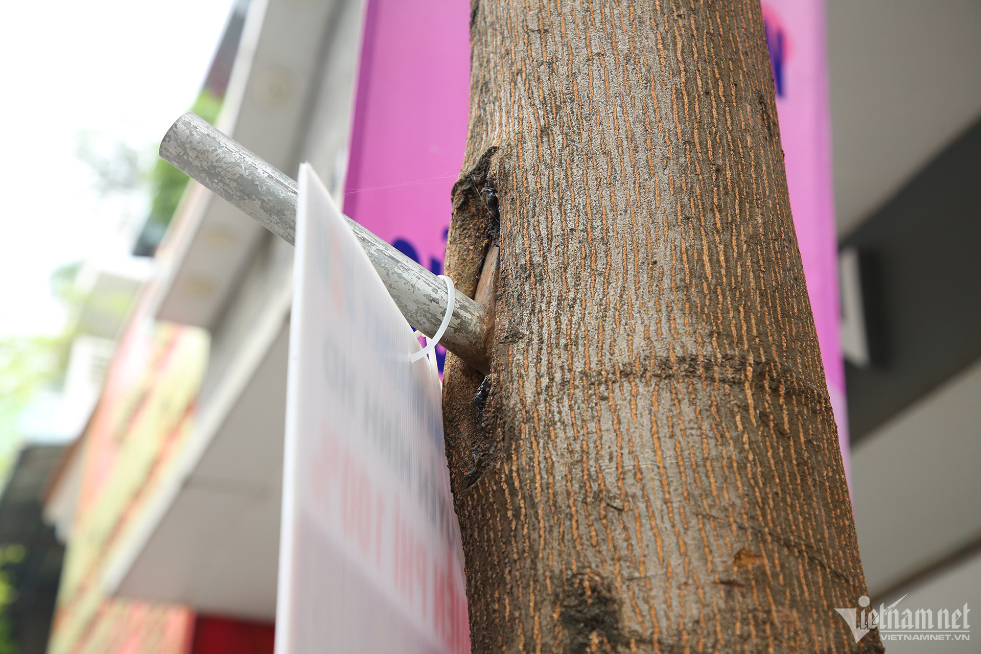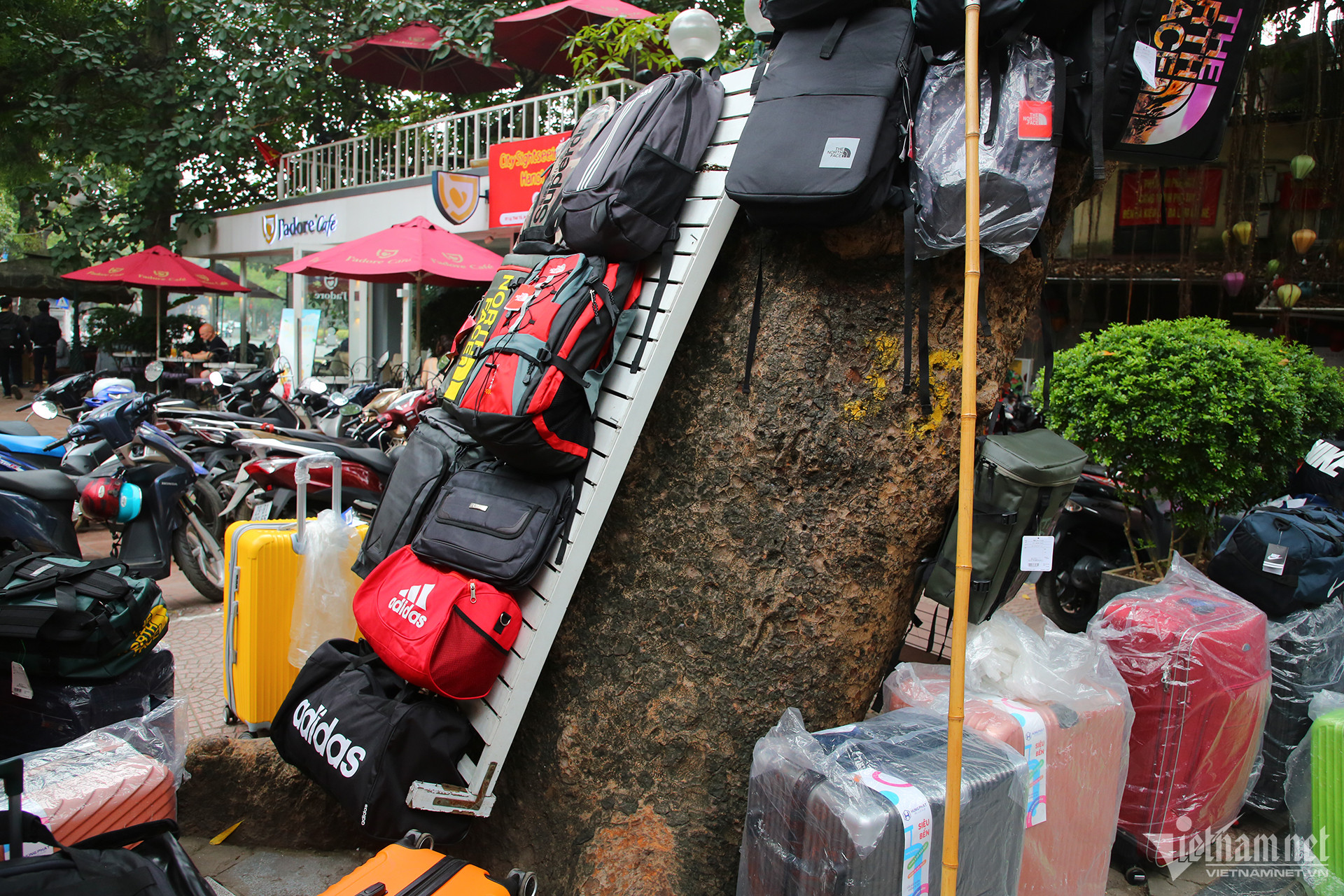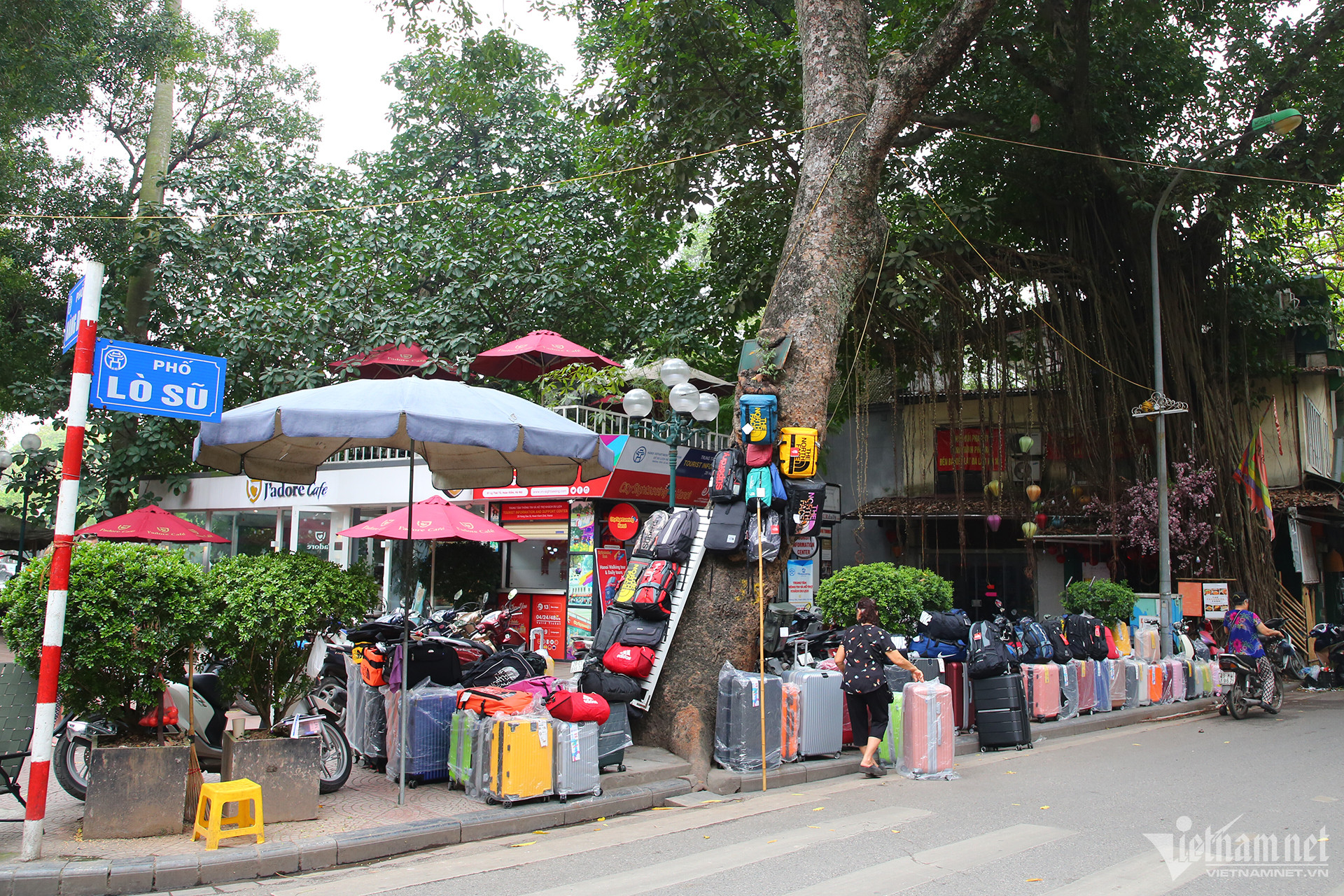 Đầu phố Lò Sũ (quận Hoàn Kiếm), một người phụ nữ đã đóng đinh vào thân cây làm móc treo, bày bán balô, túi xách. Theo người này, bà đã nhiều lần bị chính quyền địa phương nhắc nhở, thậm chí là xử phạt nhưng vì không còn kế sinh nhai nên vẫn phải làm vậy.