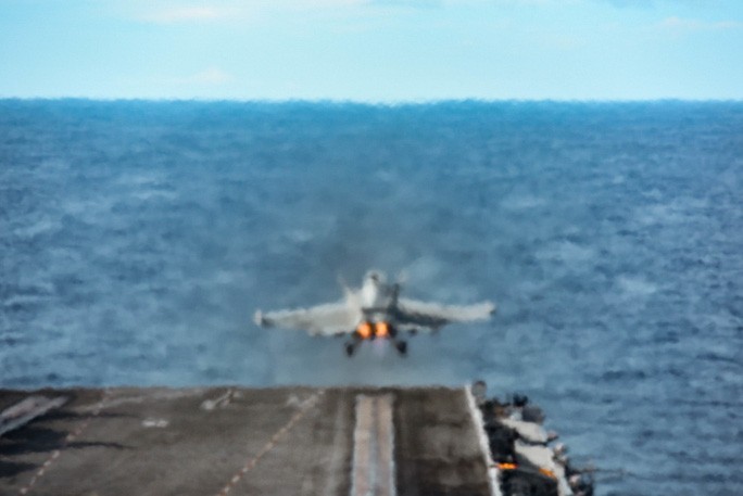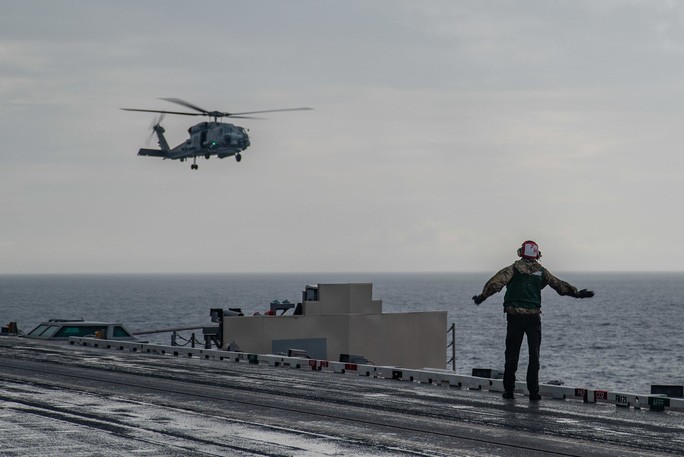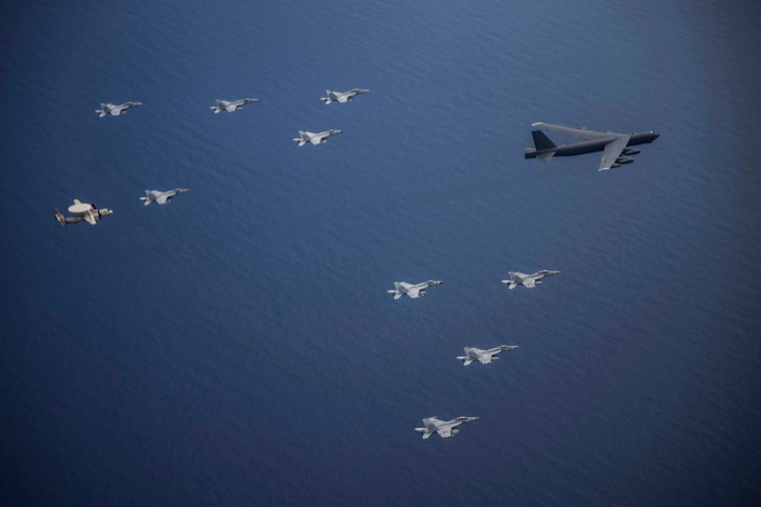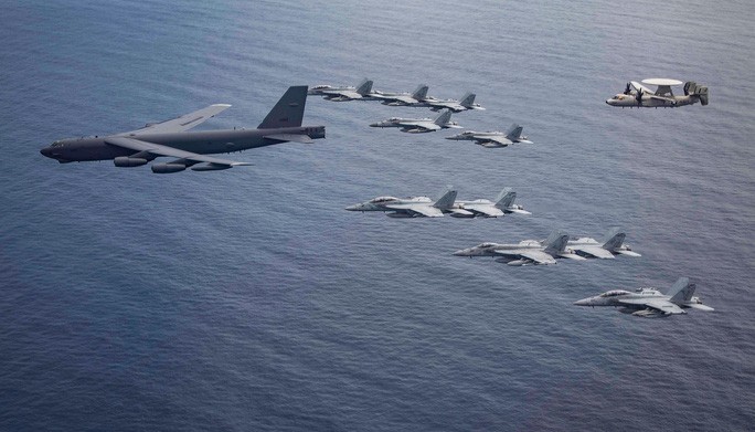 Ngoài ra, trong thông điệp cảnh báo khác gửi đến Trung Quốc, một chiếc máy bay ném bom B-52 Stratofortress vừa có chuyến bay 28 giờ từ căn cứ không quân Barksdale, bang Louisiana - Mỹ để tham gia tập trận với các máy bay từ hai tàu sân bay USS Ronald Reagan và USS Nimitz ở biển Đông.