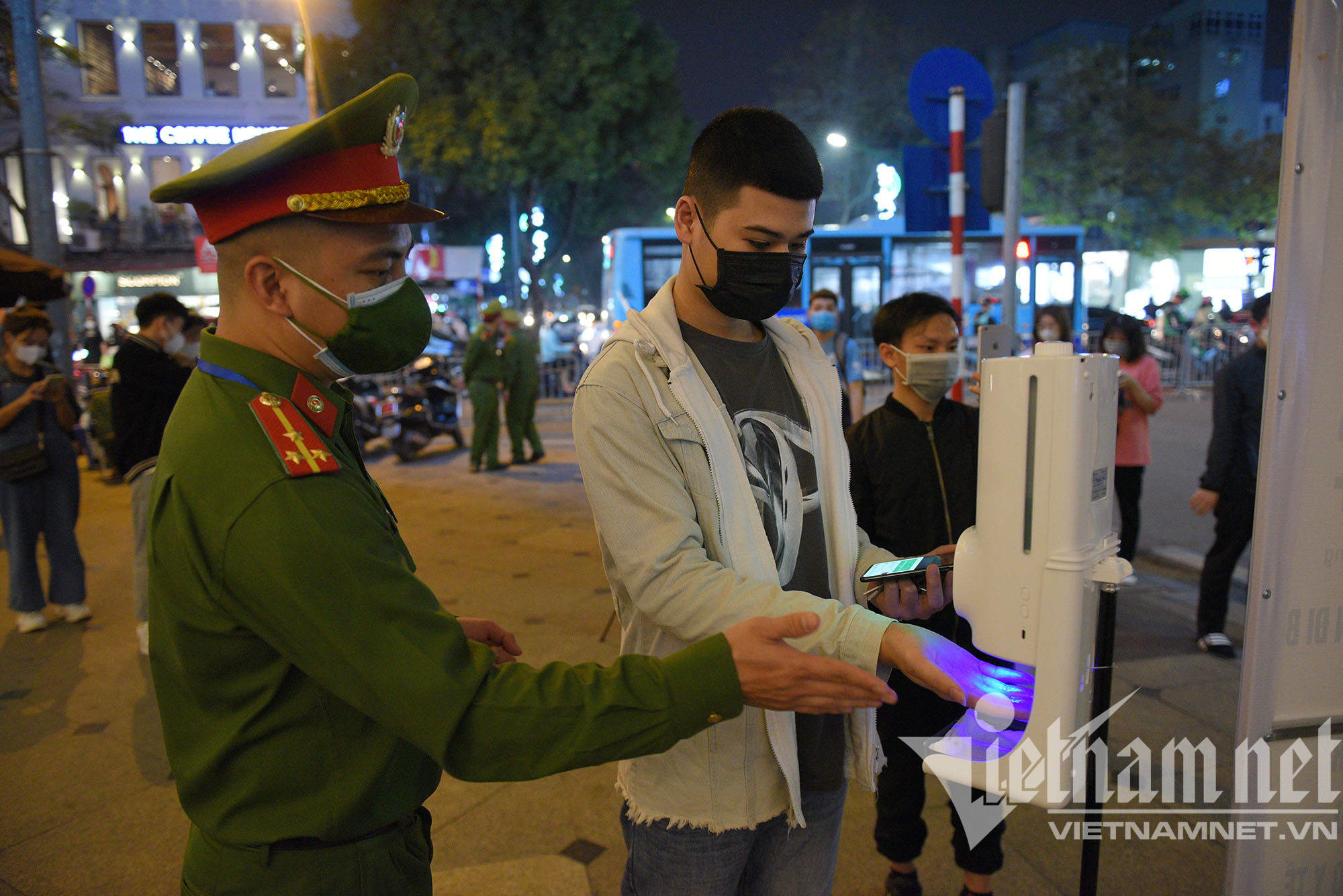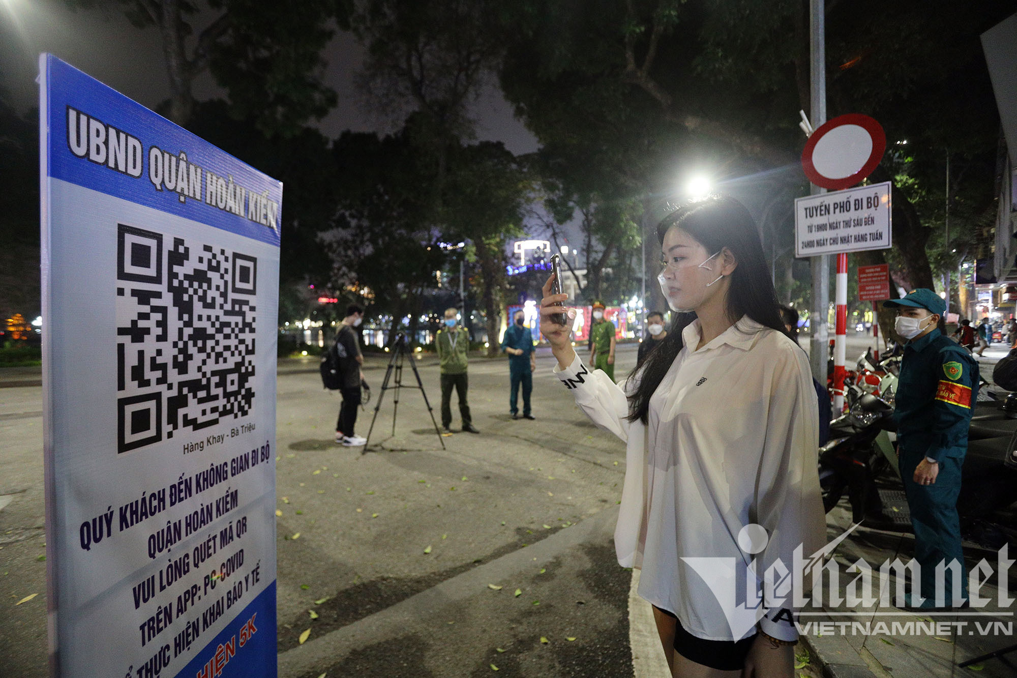 Người dân đến phố đi bộ phải đo thân nhiệt, xịt khuẩn tay, quét mã QR khai báo y tế.