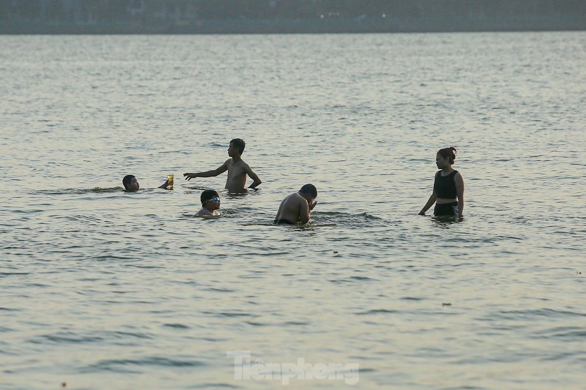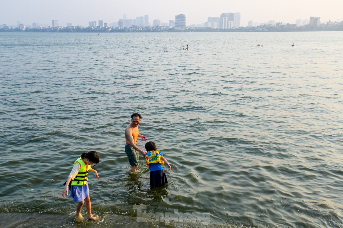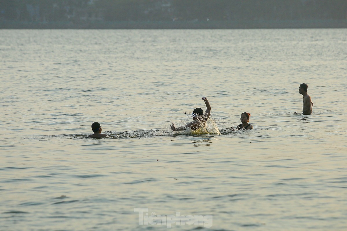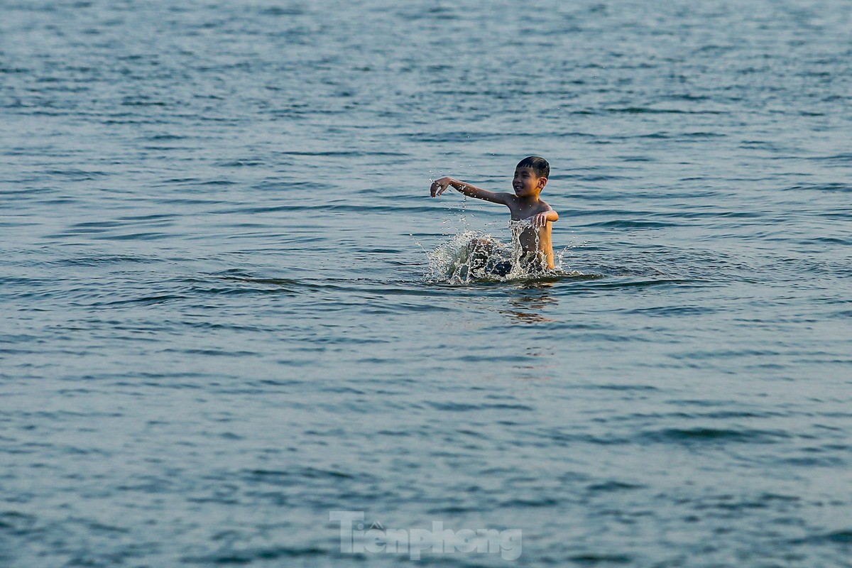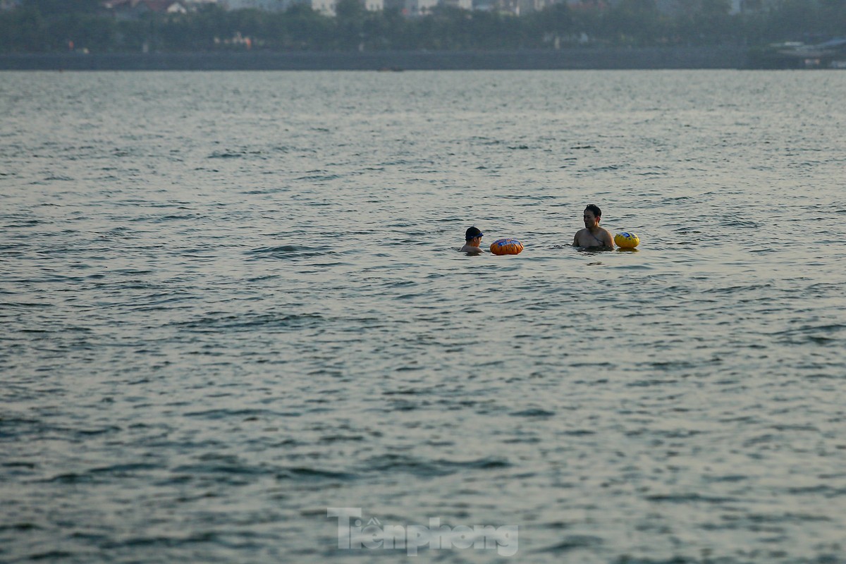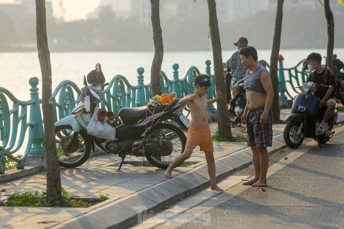 Ghi nhận của PV, tại khu vực đường ven Hồ Tây, đoạn trên phố Quảng Bá (phường Quảng An, quận Tây Hồ) vào buổi sáng sớm hoặc chiều muộn, có rất nhiều người đến đây để tắm giải nhiệt, trong đó có cả trẻ em.