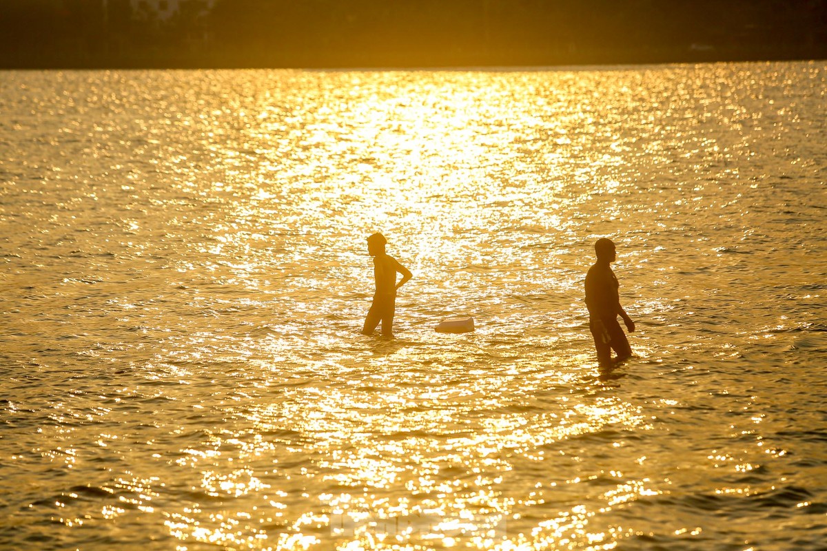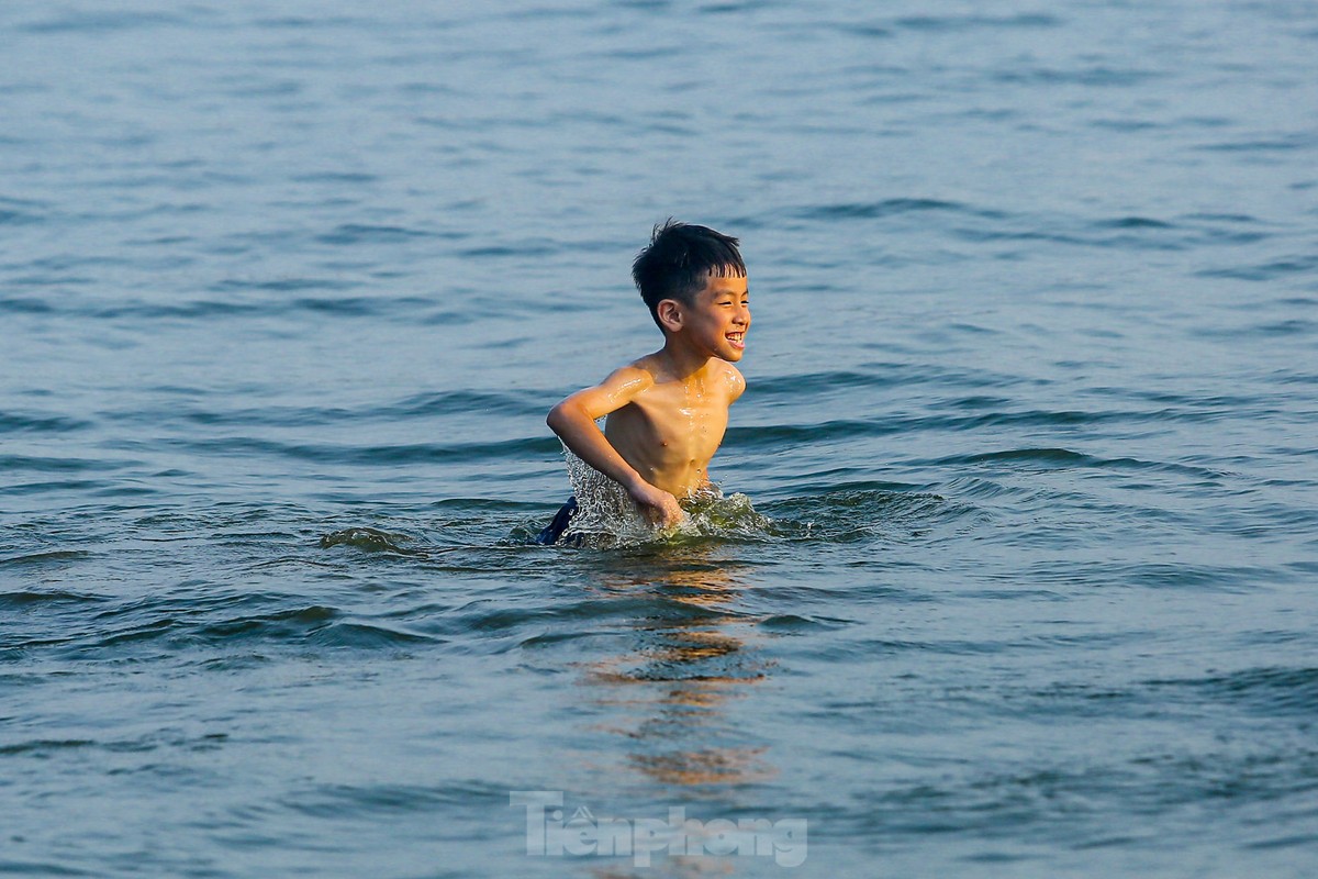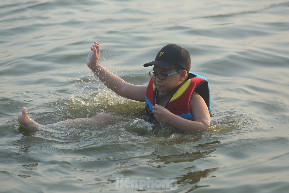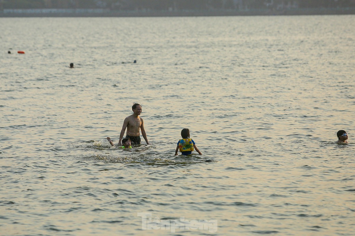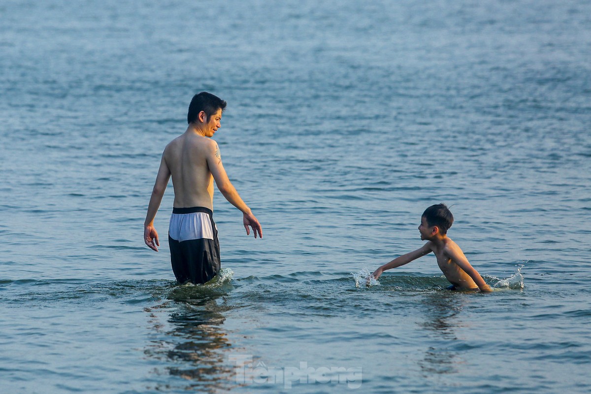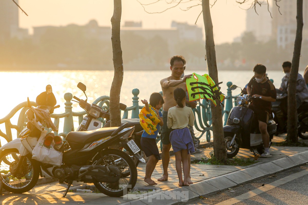 Ghi nhận của PV, tại khu vực đường ven Hồ Tây, đoạn trên phố Quảng Bá (phường Quảng An, quận Tây Hồ) vào buổi sáng sớm hoặc chiều muộn, có rất nhiều người đến đây để tắm giải nhiệt, trong đó có cả trẻ em.