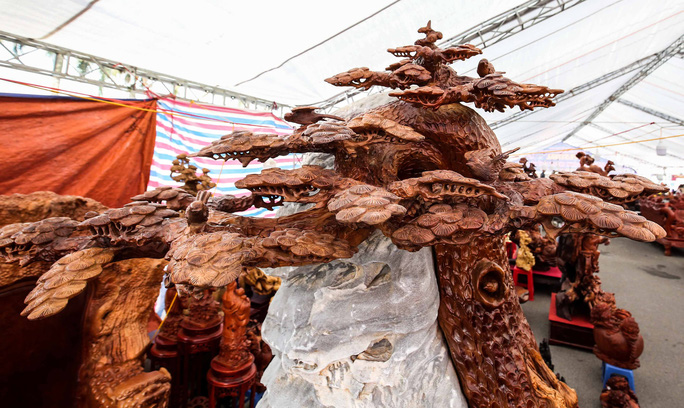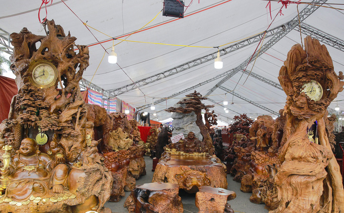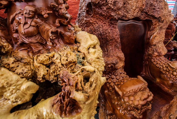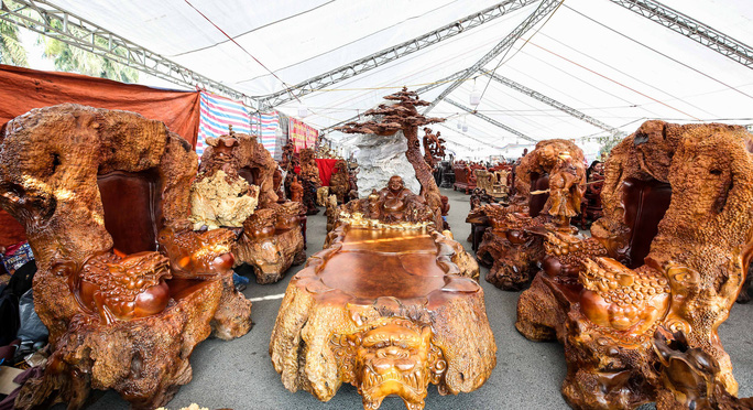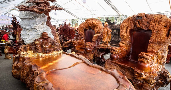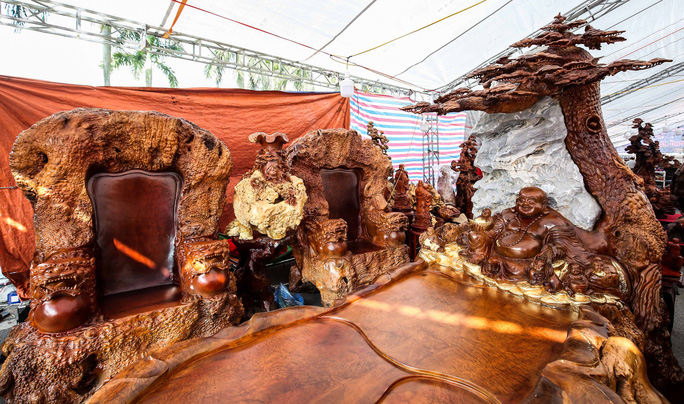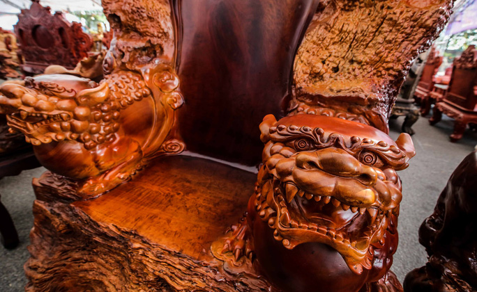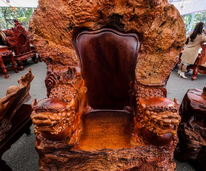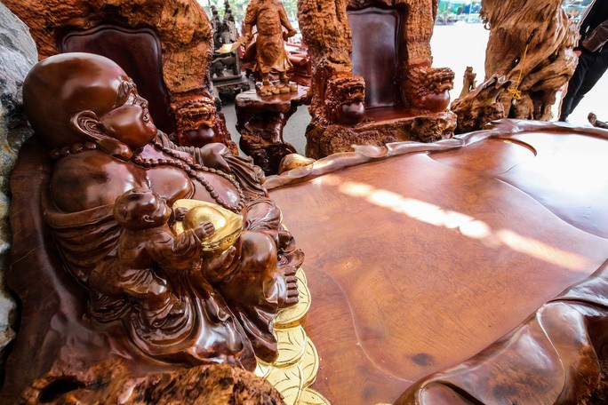 Bộ bàn ghế đặc biệt này được làm từ gỗ nu kháo gồm 9 món đồ, nặng khoảng 4 tấn và thời gian chế tác khoảng 1 năm được chủ nhân chào bán với giá 3 tỉ đồng. Đặc biệt, bộ bàn ghế này kích thước lớn, chỉ phù hợp với những biệt thự siêu rộng.