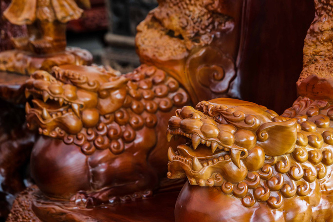 Anh Lương Long Nhật, chủ xưởng gỗ tại Nghệ An, chủ nhân bộ bàn ghế trên, cho biết: "Để hoàn thiện bộ bàn ghế "Cửu lân quần tụ" này, 8 người thợ chính phải làm liên tục trong vòng 1 năm. Chiếc bàn chính dài khoảng hơn 3 mét, trên bàn là tượng Phật Di Lặc ngồi dưới gốc tùng, lưng tựa phiến đá. Dưới chân bức tượng là những chi tiết trang trí được mạ vàng lá Đài Loan".
