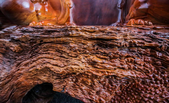 Anh Long cho biết thêm: "Một khúc gỗ nguyên khối kích thước lớn ôm cục đá như thế này rất hiếm gặp ở Việt Nam. Tất cả được chế tác từ phần gỗ nguyên khối, với 9 món đồ gồm bàn, ghế, chân đôn, tượng… Và bộ bàn ghế này chỉ phù hợp với căn phòng có diện tích từ 35 m2 trở lên".