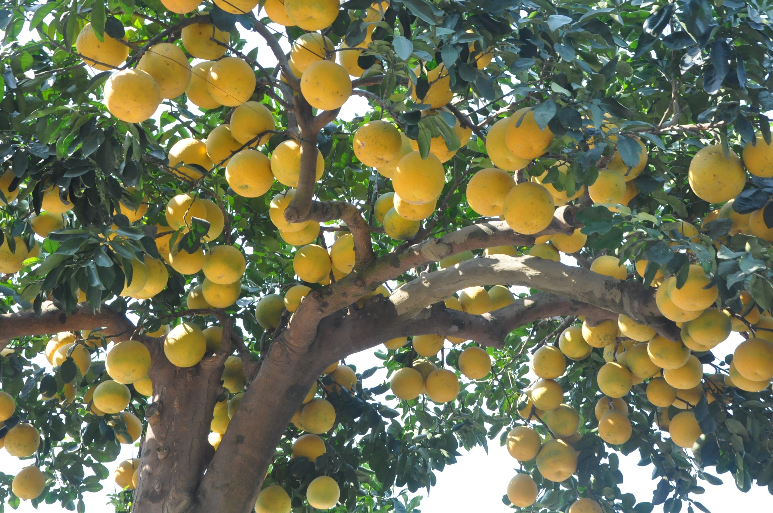 Từ bên dưới nhìn lên, hàng trăm quả bưởi chín vàng óng, trông rất đẹp mắt.