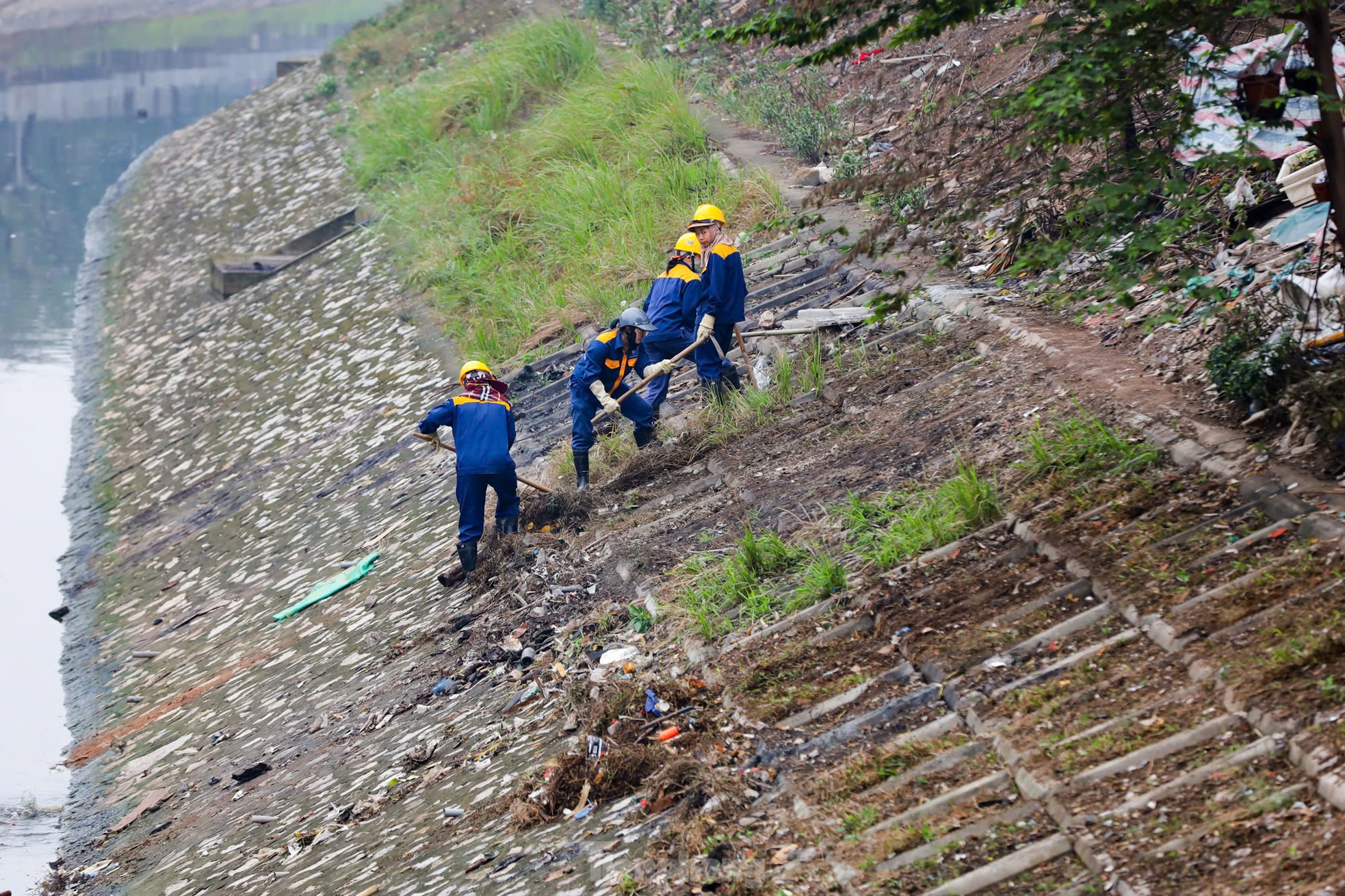 Những ngày qua, dù thời tiết mưa rét nhưng hàng chục công nhân vẫn ngâm mình dưới dòng nước thải đen kịt và hôi thối để nạo vét bùn đất, rác thải làm sạch sông Tô Lịch.