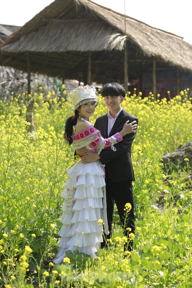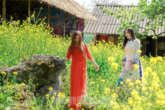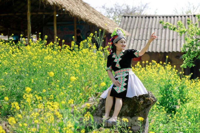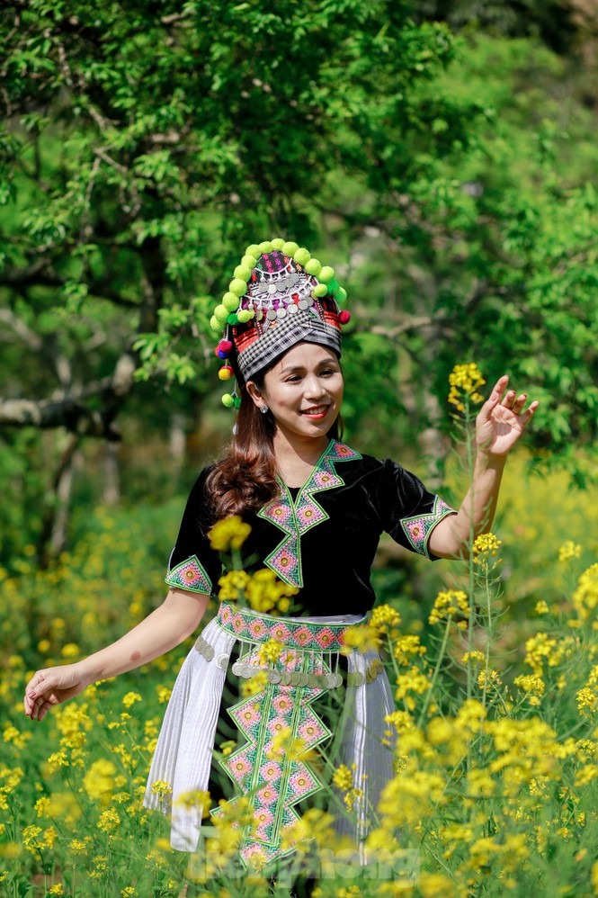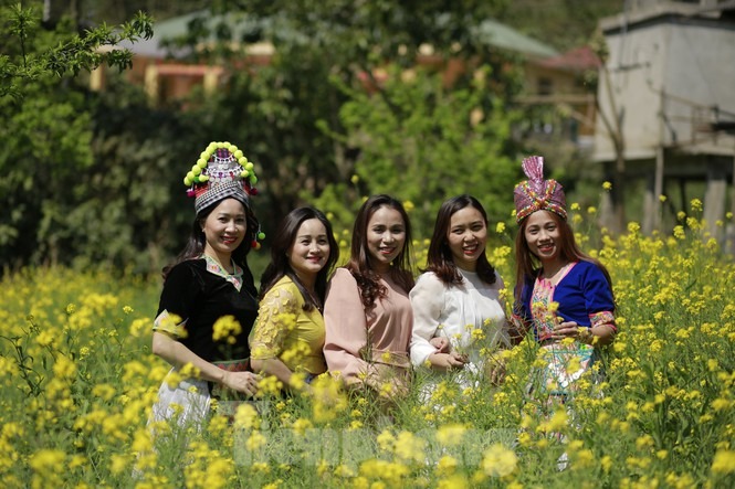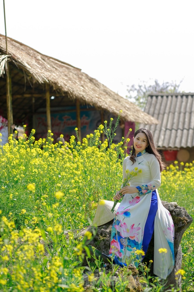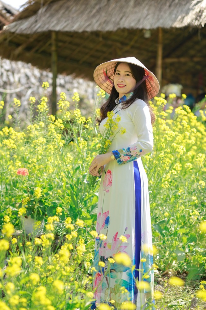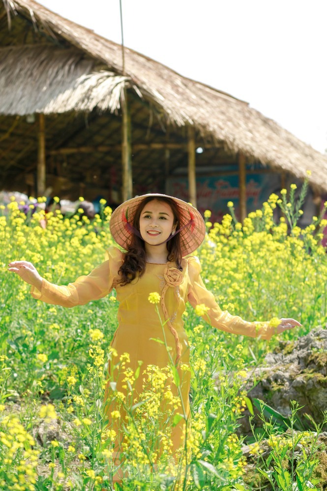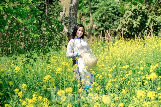 Hình ảnh chiếc nón lá cùng tà áo dài thướt tha tung bay trong gió quện cùng sắc vàng rực của hoa cải nơi cổng trời Mường Lống đẹp như một bức tranh. Vẻ đẹp phù dung khiến du khách quên lối về.