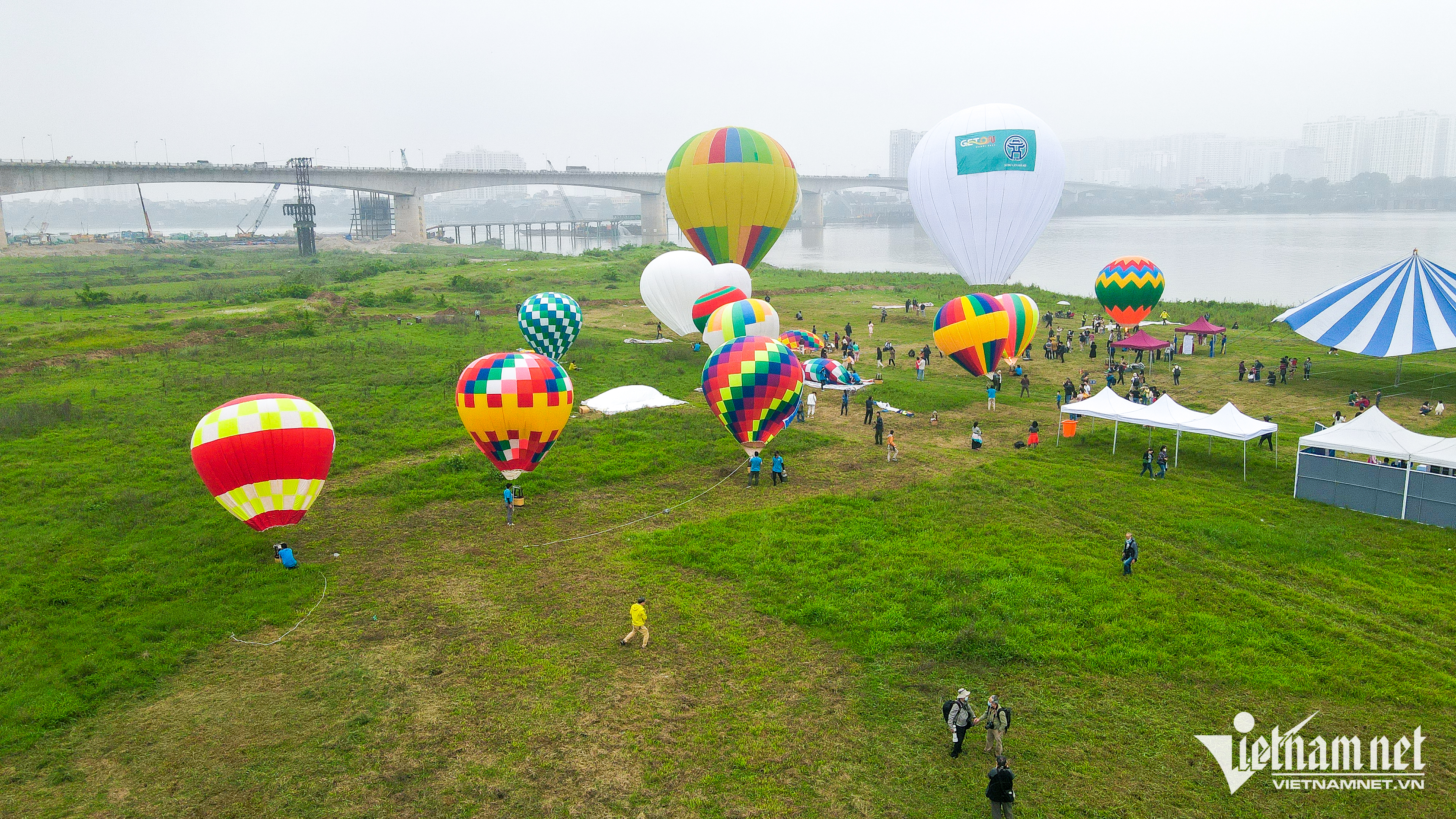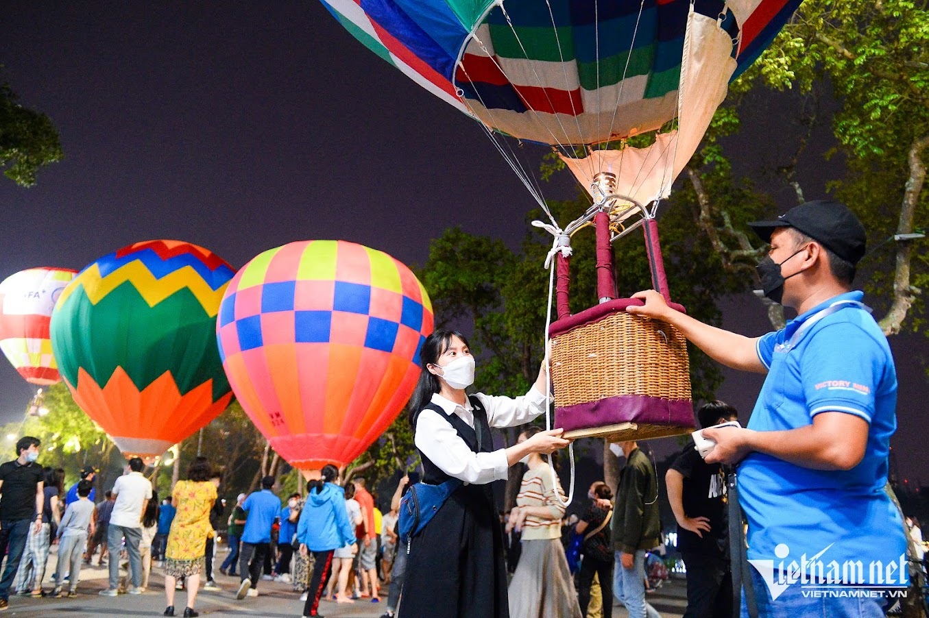Từ 8h đến 21h các ngày 25-27/3, tại khu vườn nhãn quận Long Biên có 22 quả khinh khí cầu các loại, bay lơ lửng ở các độ cao trên sông Hồng. Du khách tới đây được trải nghiệm ngắm Hà Nội từ trên cao hay tham quan, chụp ảnh ngay trong khinh khí cầu nhiều màu sắc.