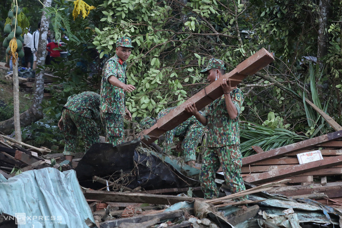 Sau vụ lở núi khiến 14 nóc nhà ở thôn 1, xã Trà Leng (huyện Nam Trà My) thành bình địa, hàng trăm người dân địa phương và bộ đội dỡ từng gốc cây, tảng đá để tìm người mất tích.
