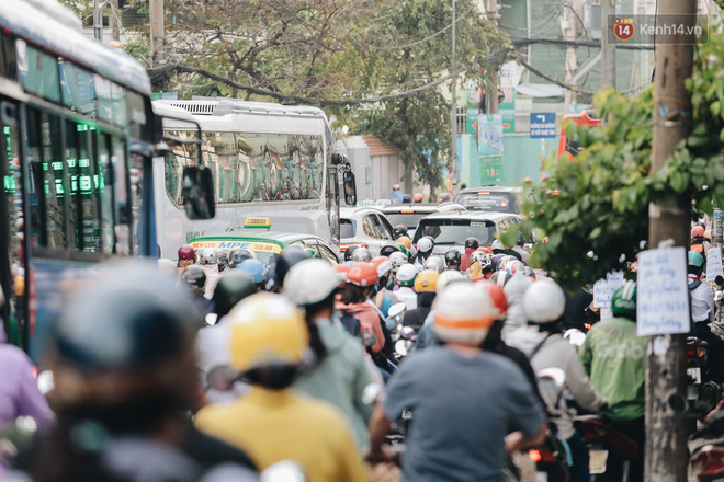 Trong khi đó trên đường Đinh Bộ Lĩnh (phường 24, quận Bình Thạnh) hướng về đường Điện Biên Phủ để đi vào trung tâm thành phố cũng ùn tắc, nhiều người đi làm sợ trễ giờ phải leo vỉa hè di chuyển.